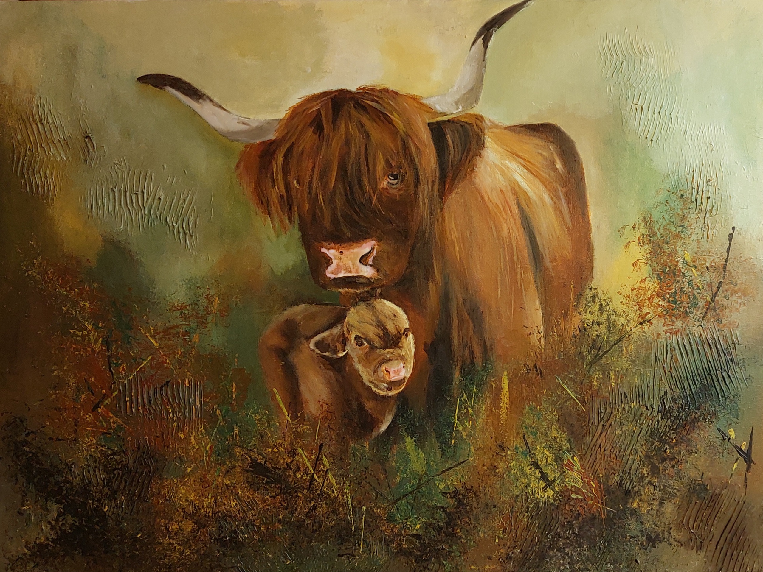 Het is zo prachtig om te zien hoe dierenmoeders met hun kleintjes omgaan. Dit is de Schotse Hooglander met haar jonge kalf. De prijs is inclusief een mooie zwarte baklijst. Dit schilderij is nu te koop met 20% korting