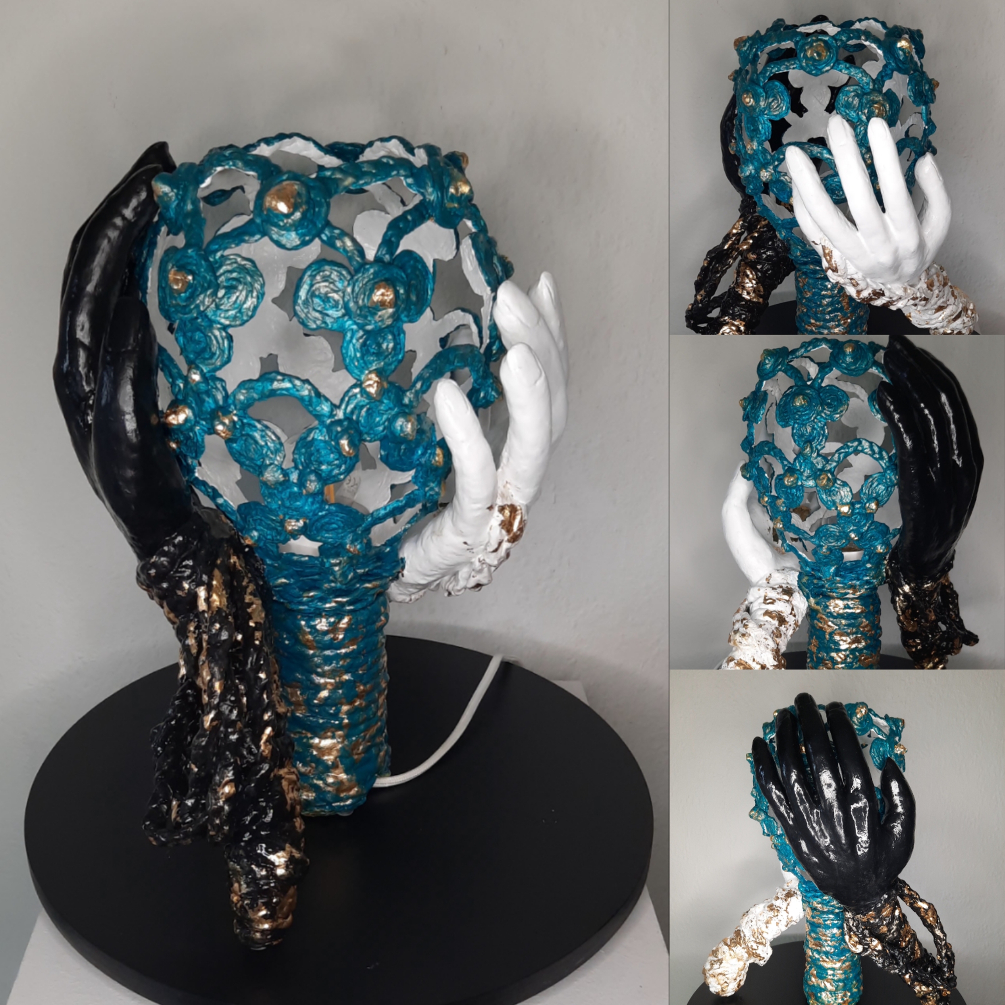 Deze tafellamp: 2 handen die het licht (lampenkap) vasthouden. De kleuren zijn zwart/wit/brons en bladgoud schilfers (22K). Het zijn 2 handen die een lampenkap vasthouden. De afmetingen zijn circa afmetingen.