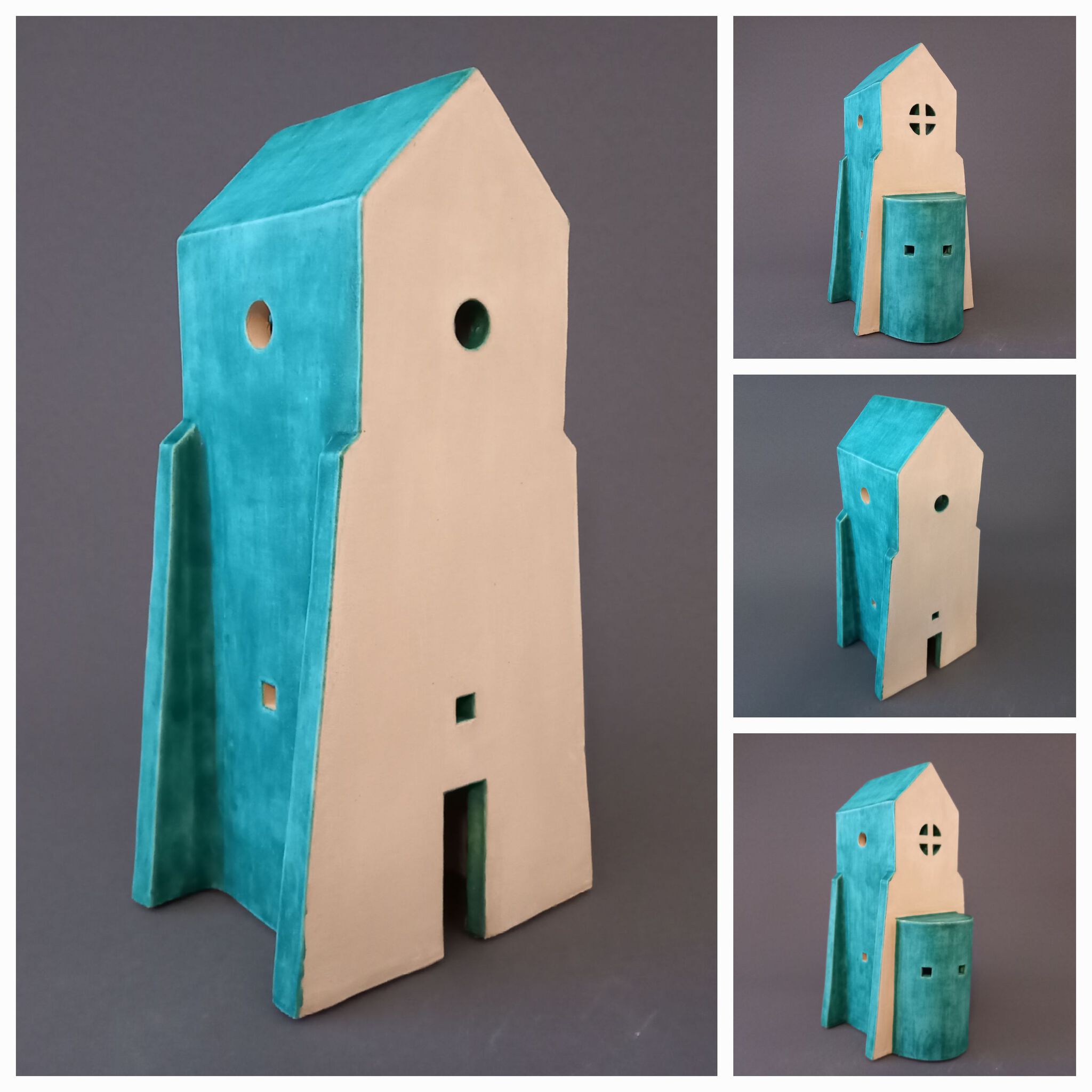Franse Kapeltoren met steunberen en absis. In witte klei en "Antik Turkis" glazuur