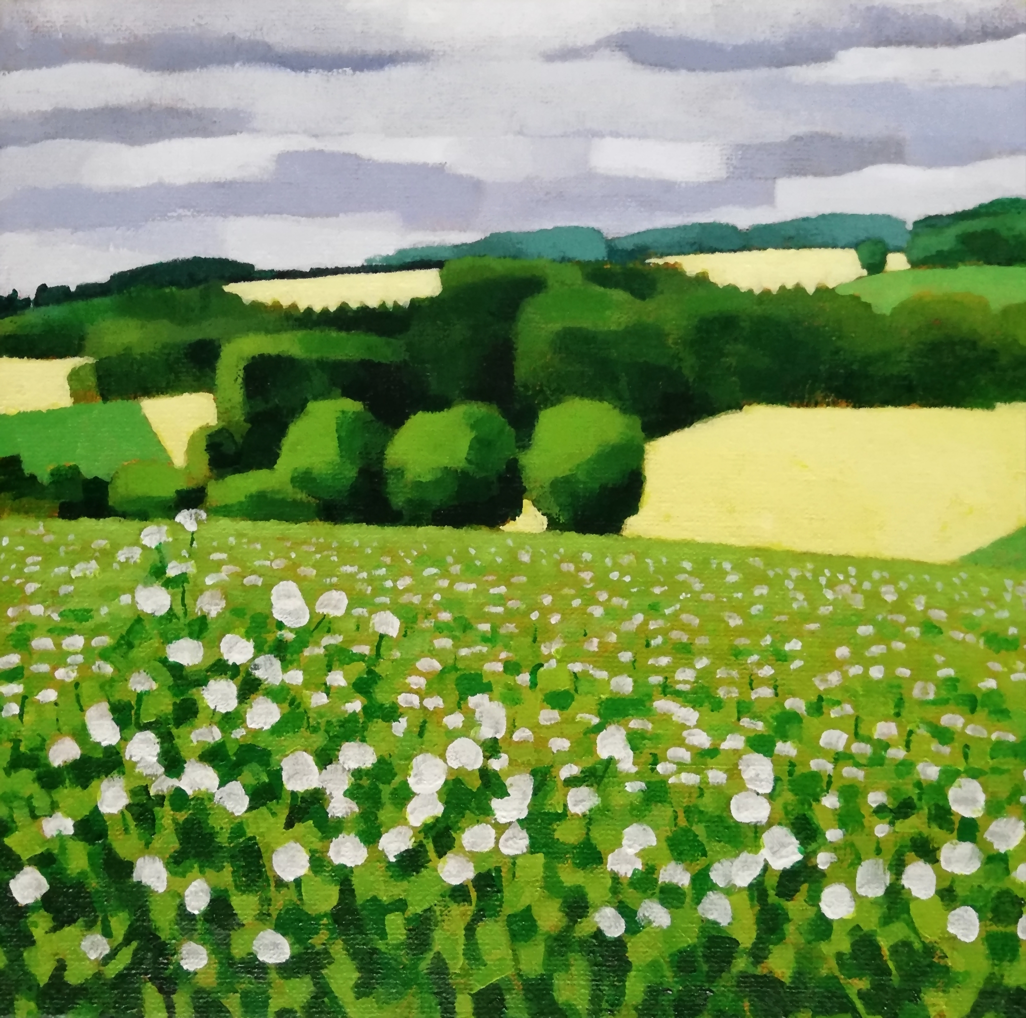 Vorig jaar heb ik een serie schilderijen gemaakt van de Eifel. Wat me aanspreekt zijn alle verschillende tinten groen en de lappendeken aan gekleurde velden die je daar in de lente aantreft. De Eifel is een bijna abstract landschap met verschillende overzichtelijke lagen en glooiende lijnen dat zich uitstekend leent tot stylering.