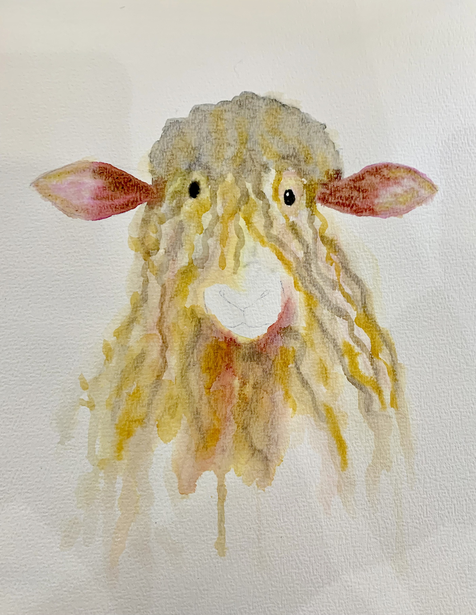 Ik kreeg schik in het tekenen/schilderen met ecoline. Dit keer een schapenkop met wollen draden. Veel wollen draden.