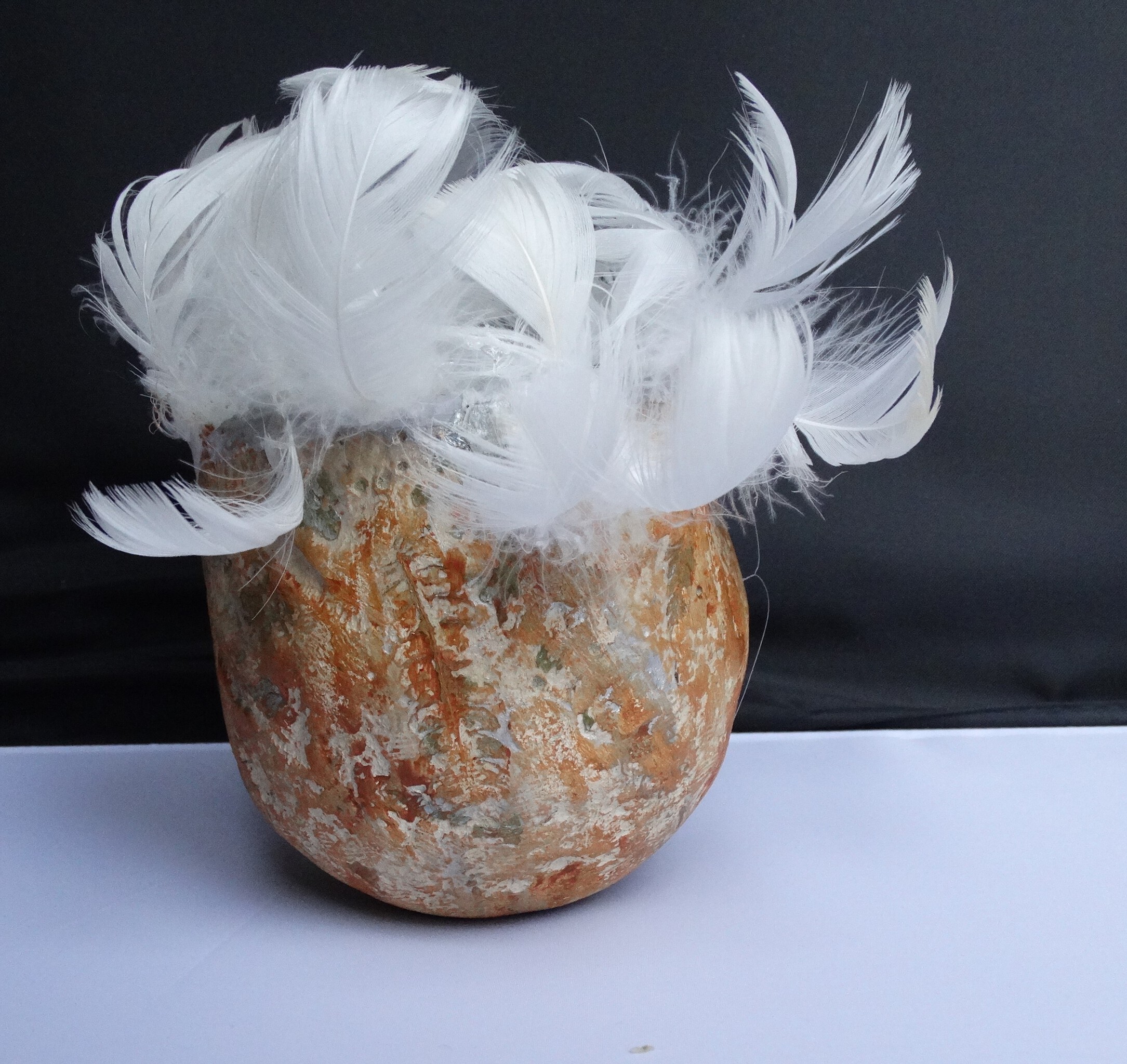Pot van papier met veren. De pot kan kantelen en komt weer in het midden terecht.