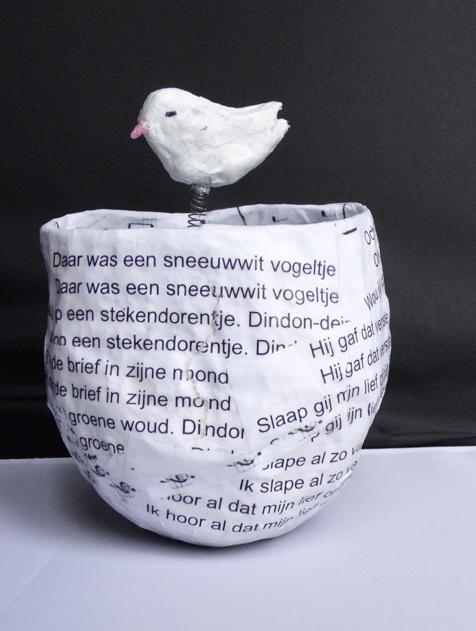 Er was een sneeuwwit vogeltje......Een liedje uit 1537. HIer verbeeld in een kantelaar met een vogeltje op een veer. Alles beweegt.