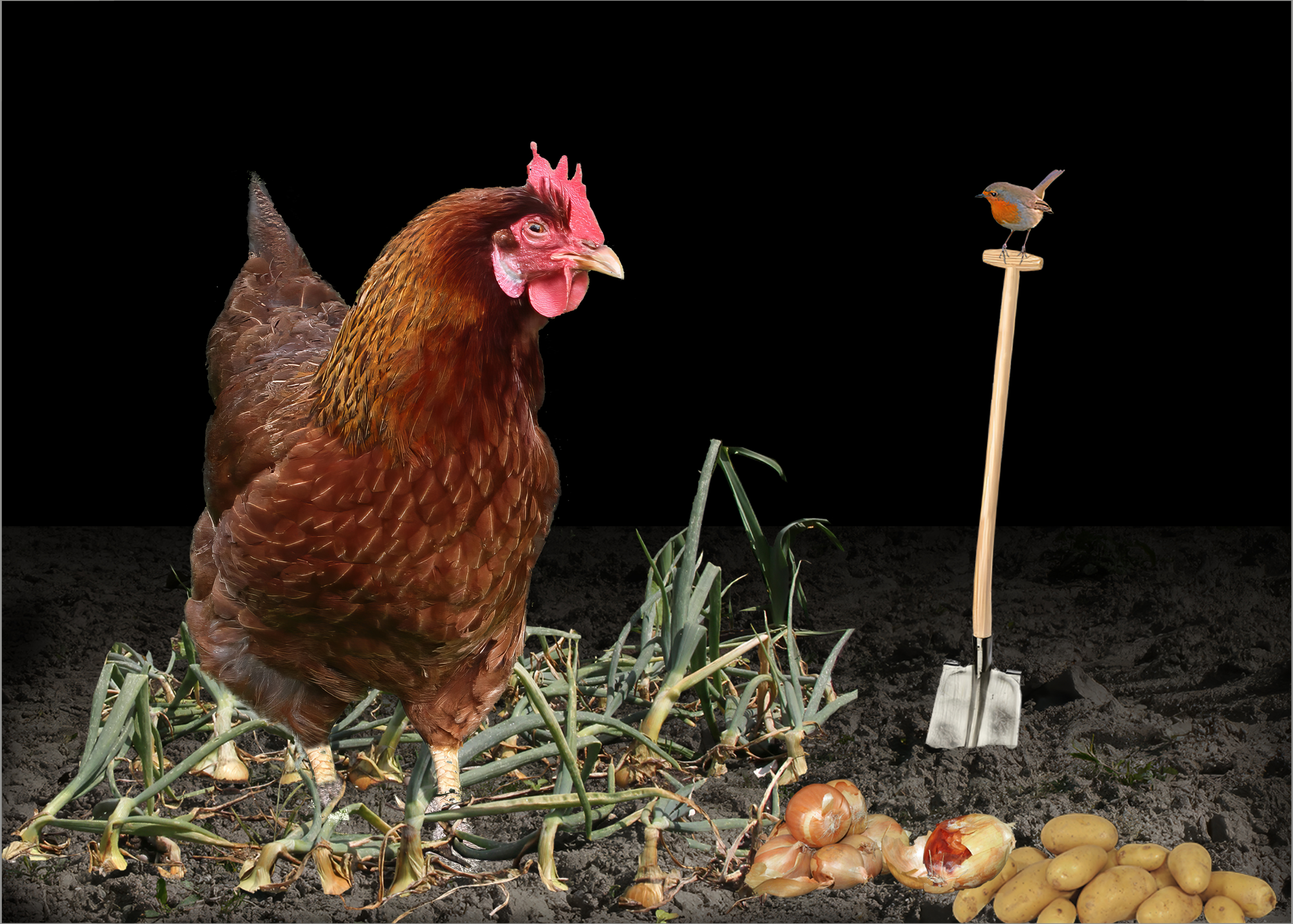 Er wordt geoogst in de moestuin. Een kip scharrelt rond en wordt gade geslagen door een roodborstje. De foto heeft een formaat van 50 x 70 en is opgeplakt op forexboard en voorzien van een ophangmogelijkheid.