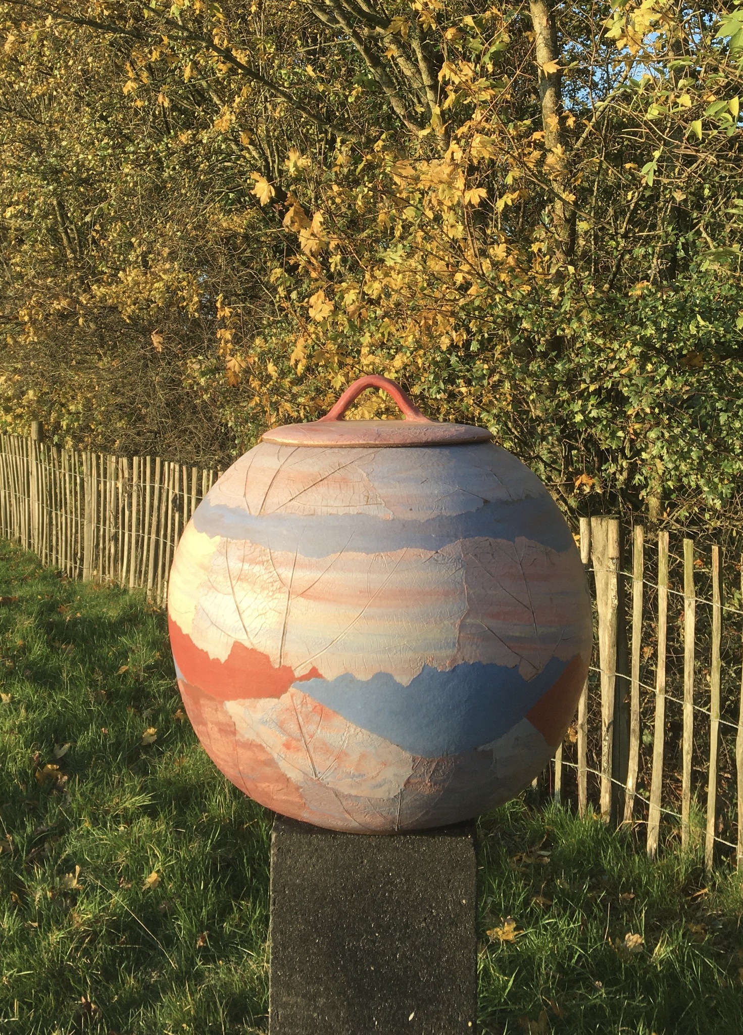 Bolvormige vaas met deksel met handgreep. Materiaal: Zwartbakkend aardewerk. Techniek: gedraaid en gedecoreerd met kleislibs waarbij gebruik is gemaakt van uitsparingstechnieken. Geglazuurd met een dunne laag transparant mat glazuur en daarna in één keer reducerend in een gasoven gestookt op 1080 graden.