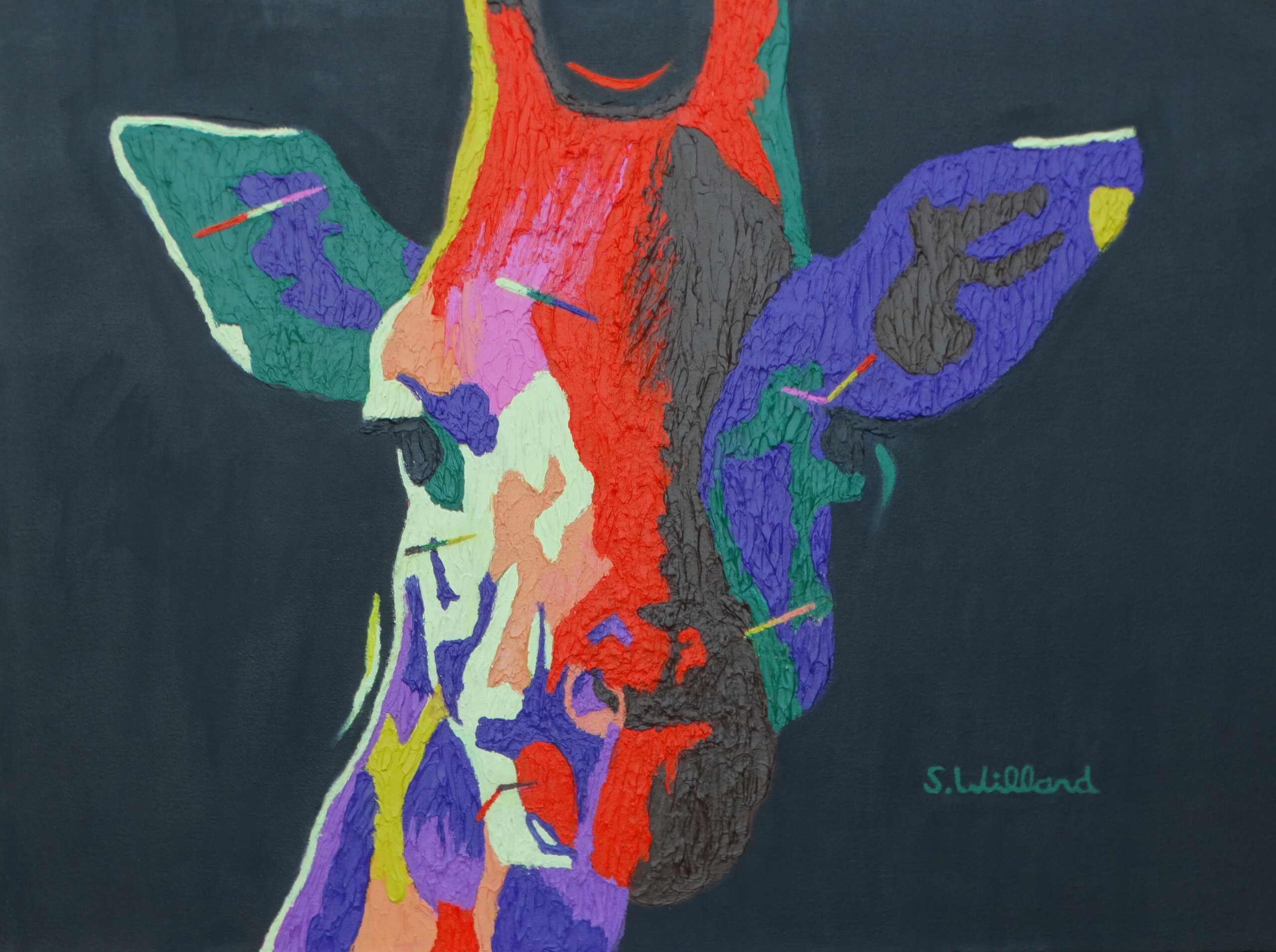 Net zoals bij mijn olifant protret heb ik het karakter van een giraf bestudeerd. Een van hun eigenschappen is dat ze behoorlijk spiritueel zijn..Dat heb ik met bepaalde kleuren weergegeven. Bovendien heb ik sommige delen heel dik geverfd en andere dun, complementaire kleuren gebruikt soms en ook sommige kleuren in elkaar laten lopen. Dit alles om een boeiende schilderij te creëren.