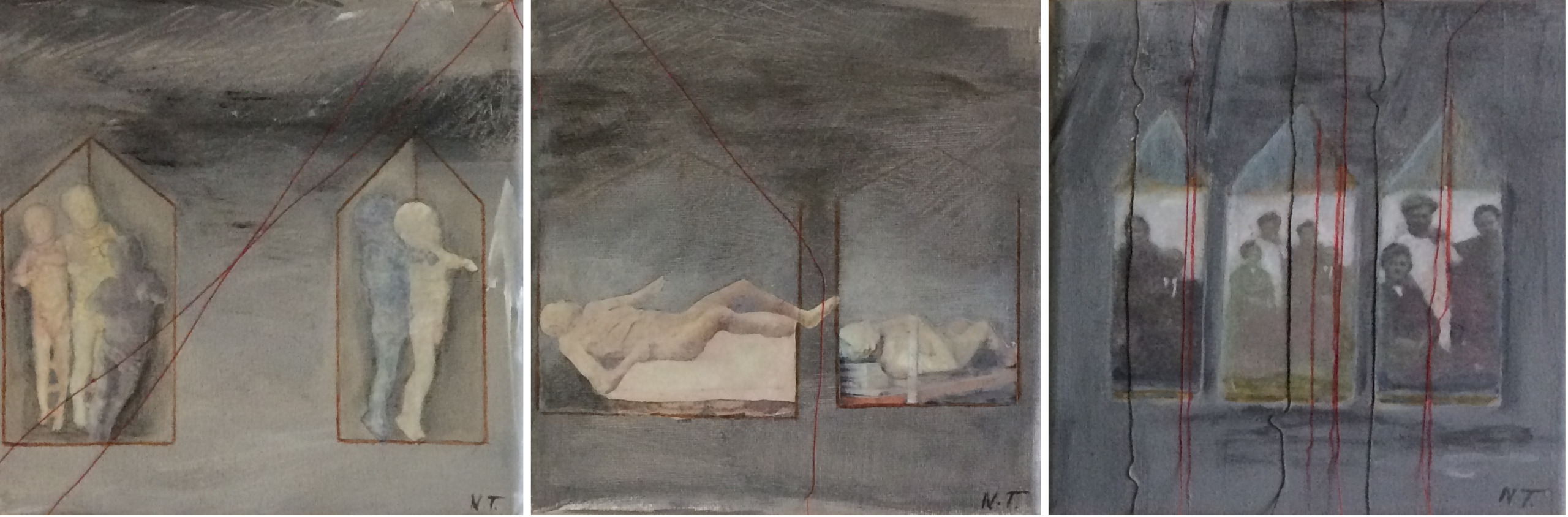 Mixed Media Acryl Doek Figuratief Grijstinten Drieluik
