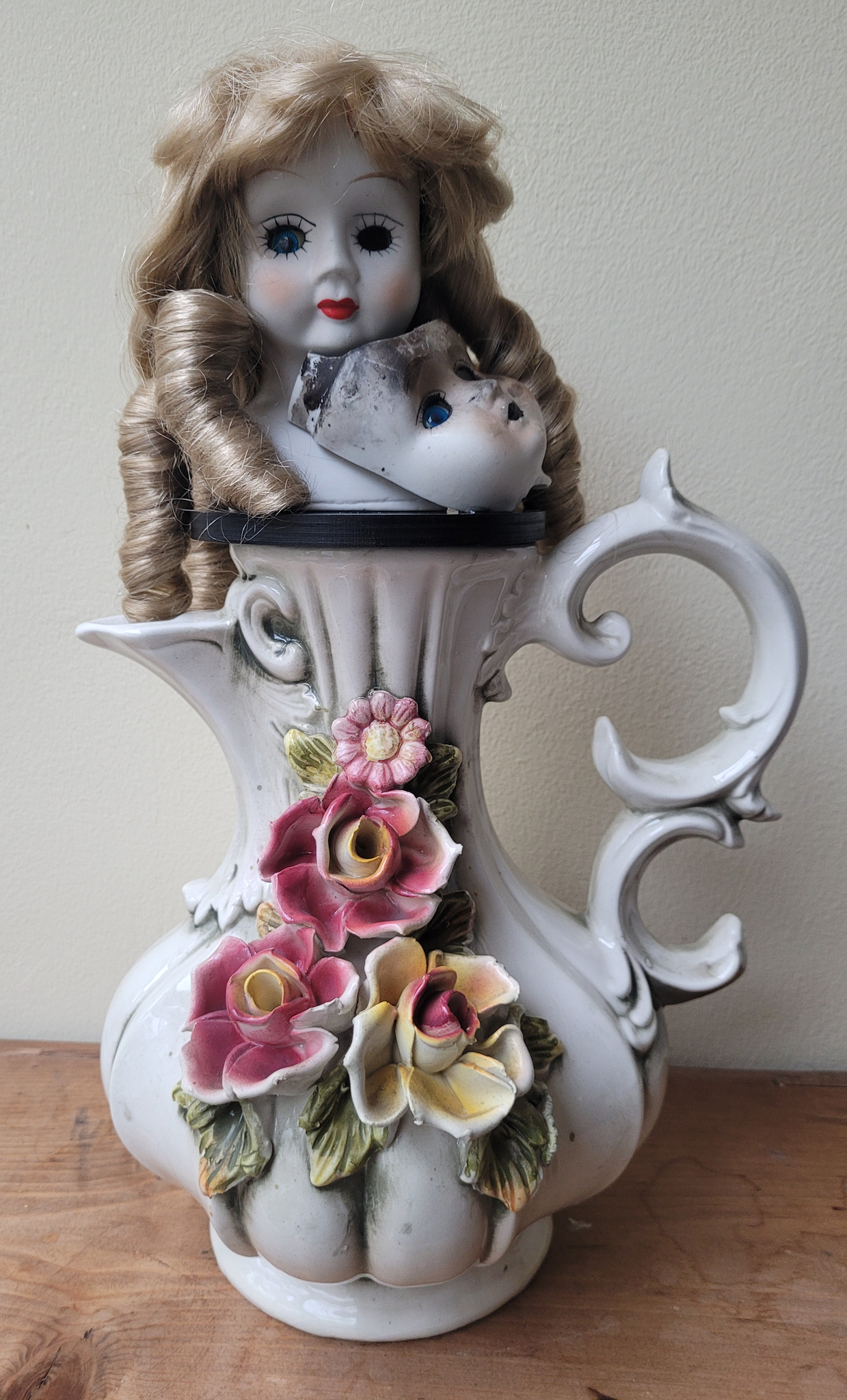 Een protserige schenkkan (je vindt 'm mooi of lelijk!) met een schattig poppenhoofdje met éen oog. Het andere oog zit in het vieze poppenhoofdje (gevonden in de Waal door www.jessiehoekstra.com)
