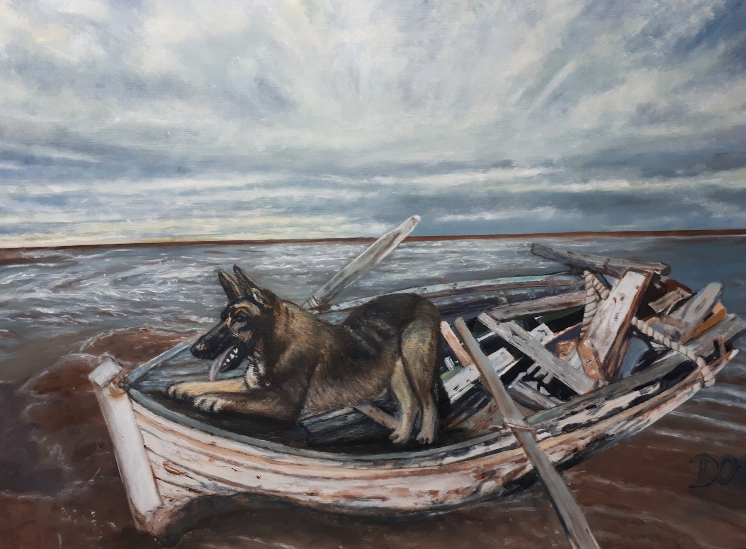 Een nieuwschierige herdershond onderzoekt een op het strand aangespoelde roeiboot. mooi drijfhout om mee te spelen en anders niets. Ingelijst in houten baklijst.
