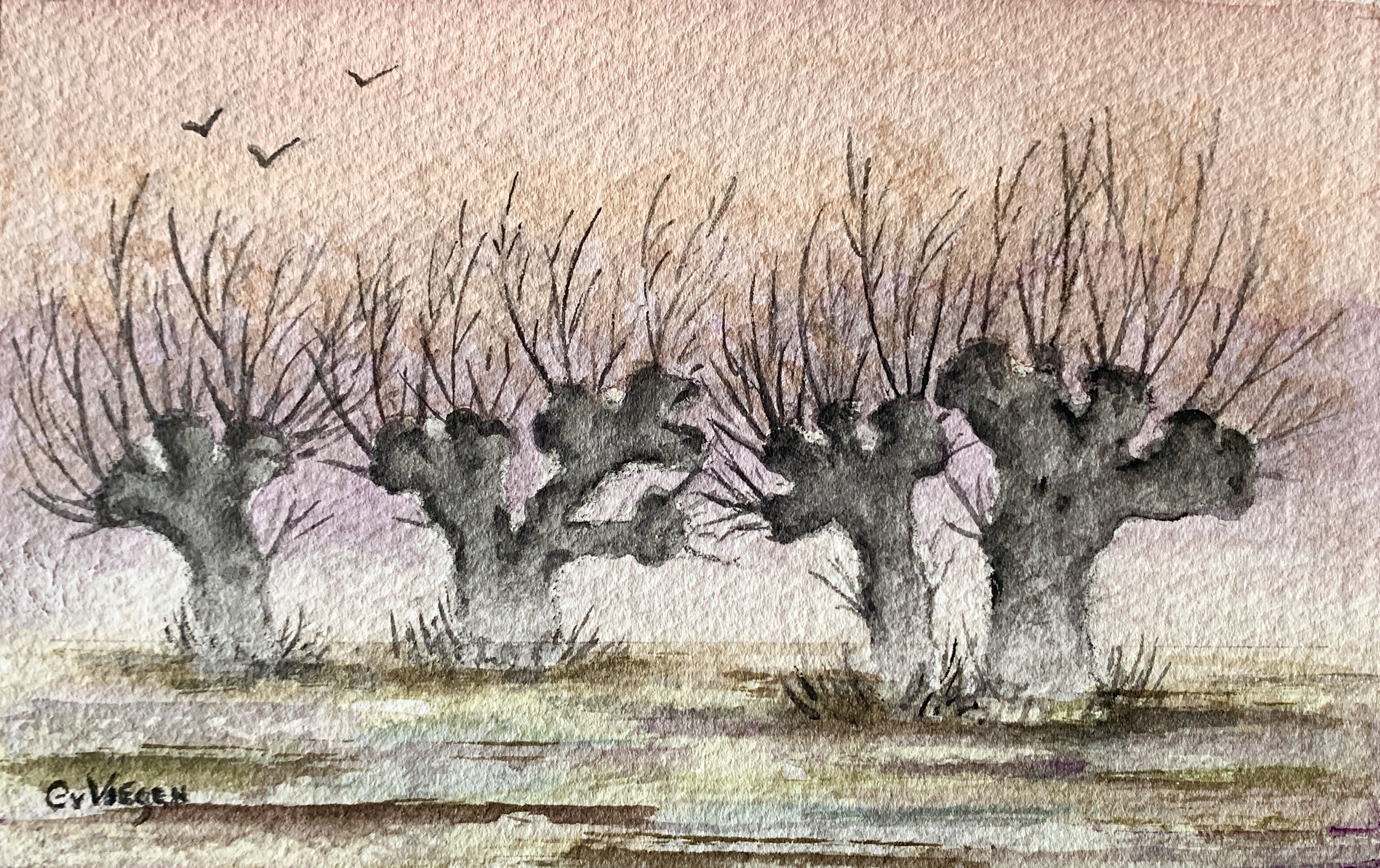 Landschap Aquarel Realistisch Natuur Bomen Boom Watercolor Mist Knotwilgen Uiterwaarden Ochtendmist