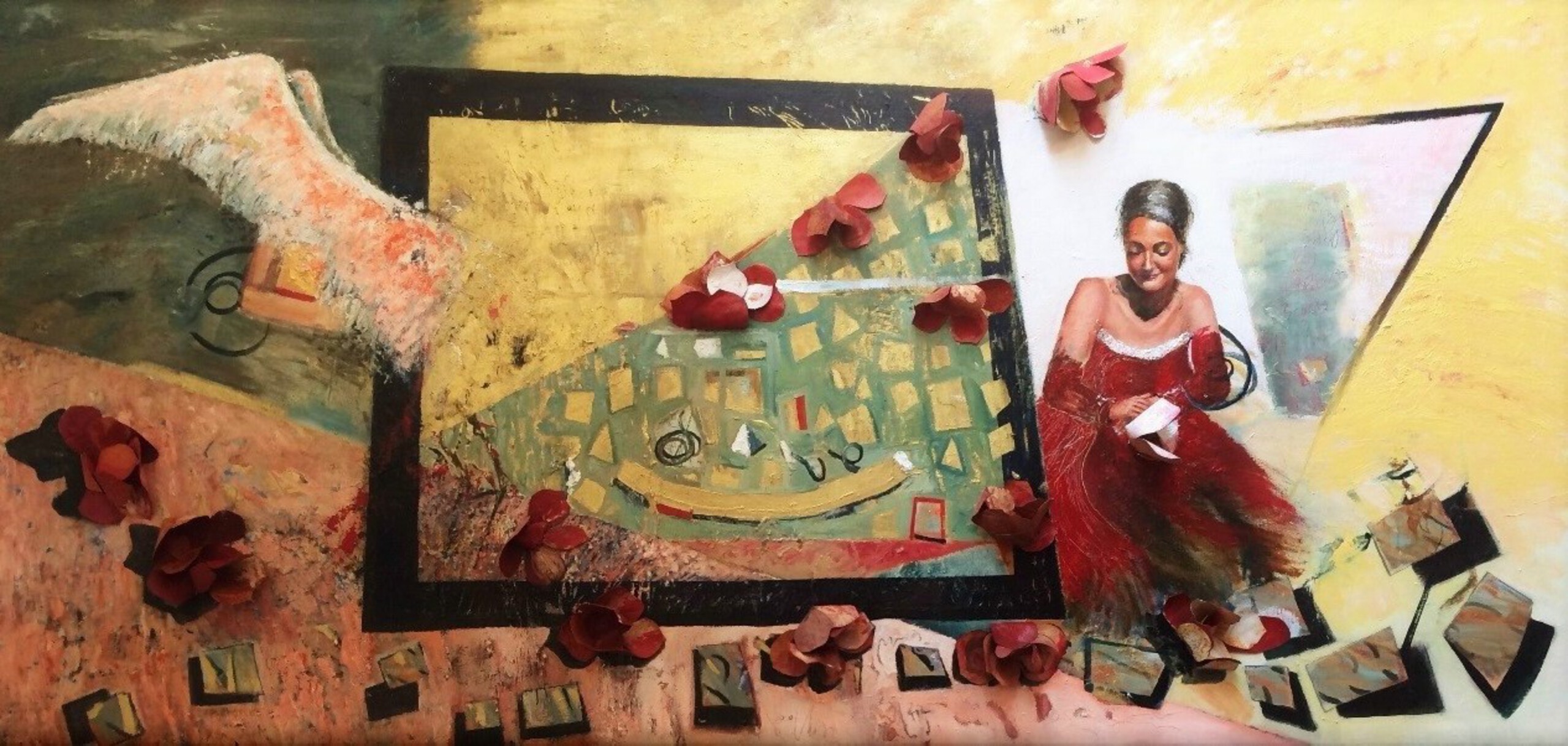 De verkondiing door de Enge, voelbaar maar niet zichtbaar. Schilderij met uitstekende geschilderde rozen