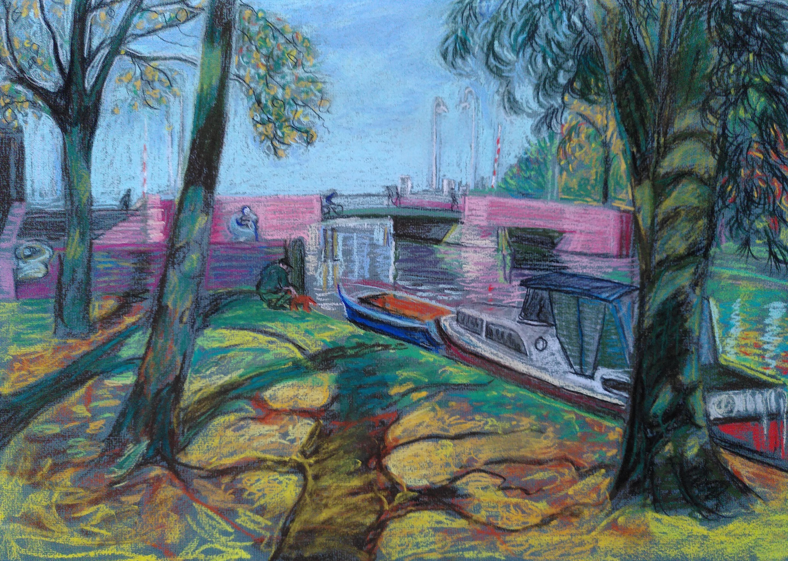 Uitzicht vanaf de groenstrook aan de Geusenkade naar de Alisusbrug in de herfst.