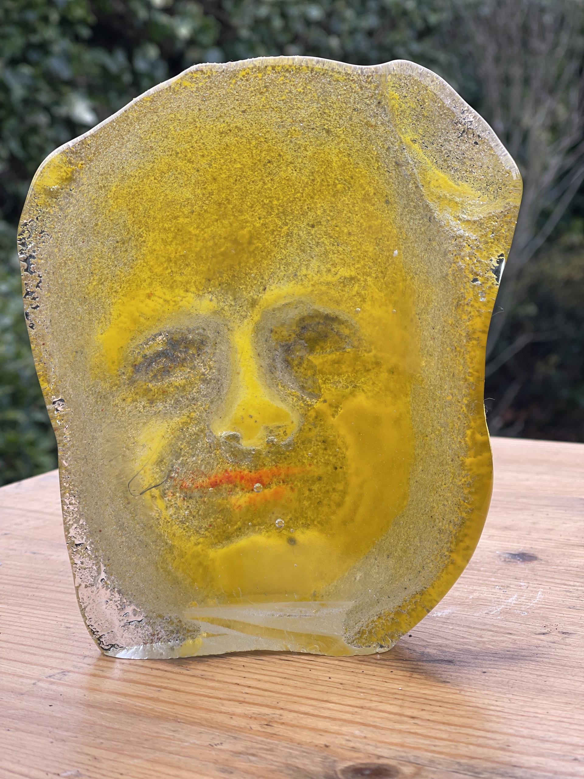 Een vriendelijk portretje in zand gegoten in voornamelijk gele kleur.