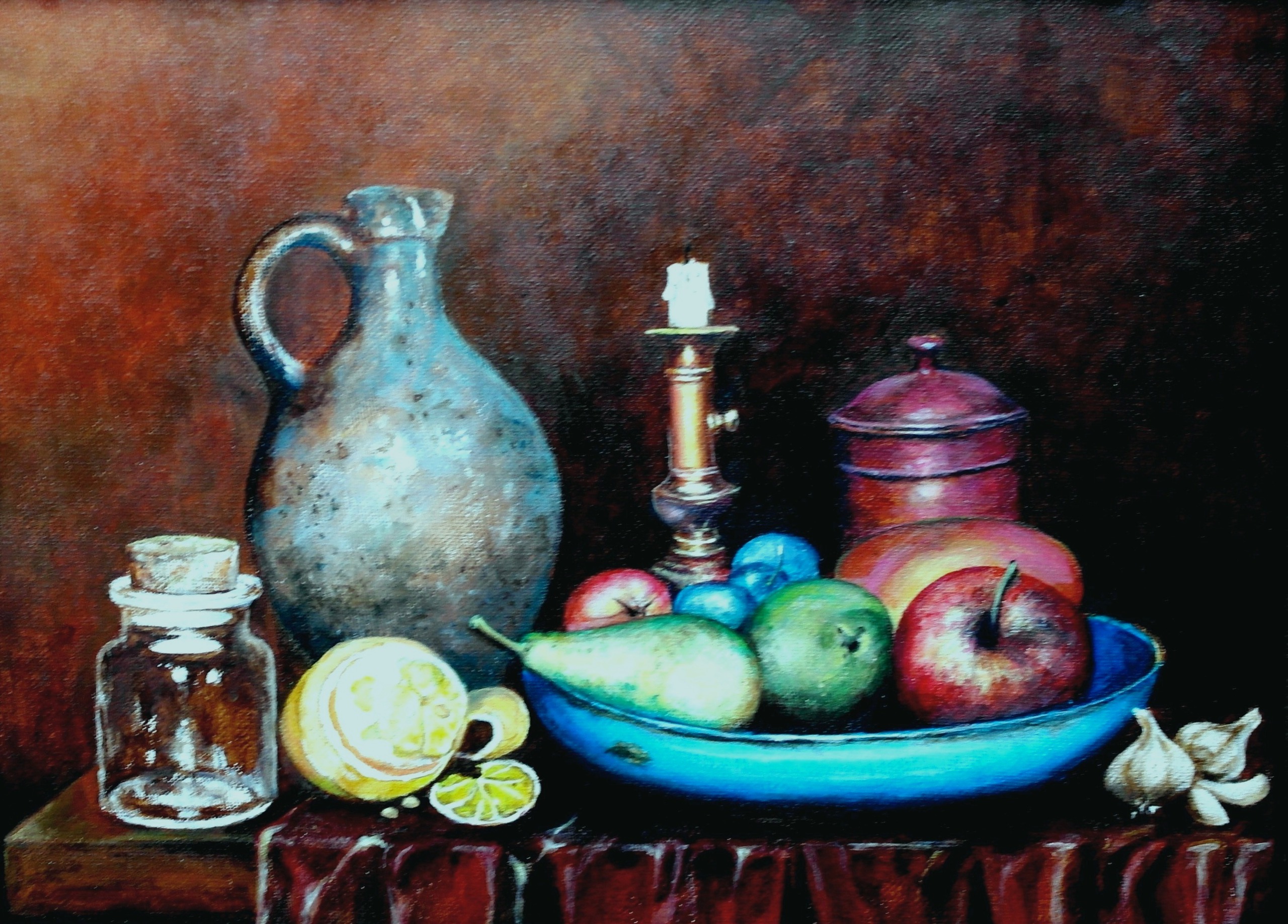 Diverse atributen uit mijn atelier aangevuld met vers fruit uit de keuken, de sinaasappel is niet vers, deze heb ik gestolen van een 17e eeuwse kunstenaar.