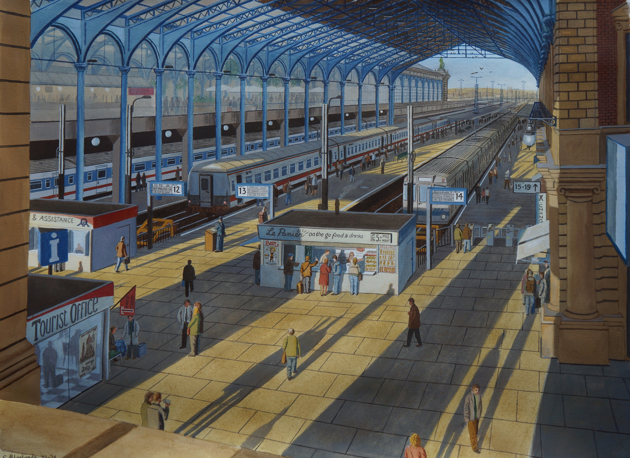 Dit denkbeeldige stationsschilderij werd in opdracht gemaakt. Ik baseerde dit beeld op talloze impressies van treinstations in heel Europa, maar gebruikte ook een schilderij dat ik in 2009 maakte als bron voor dit werk.