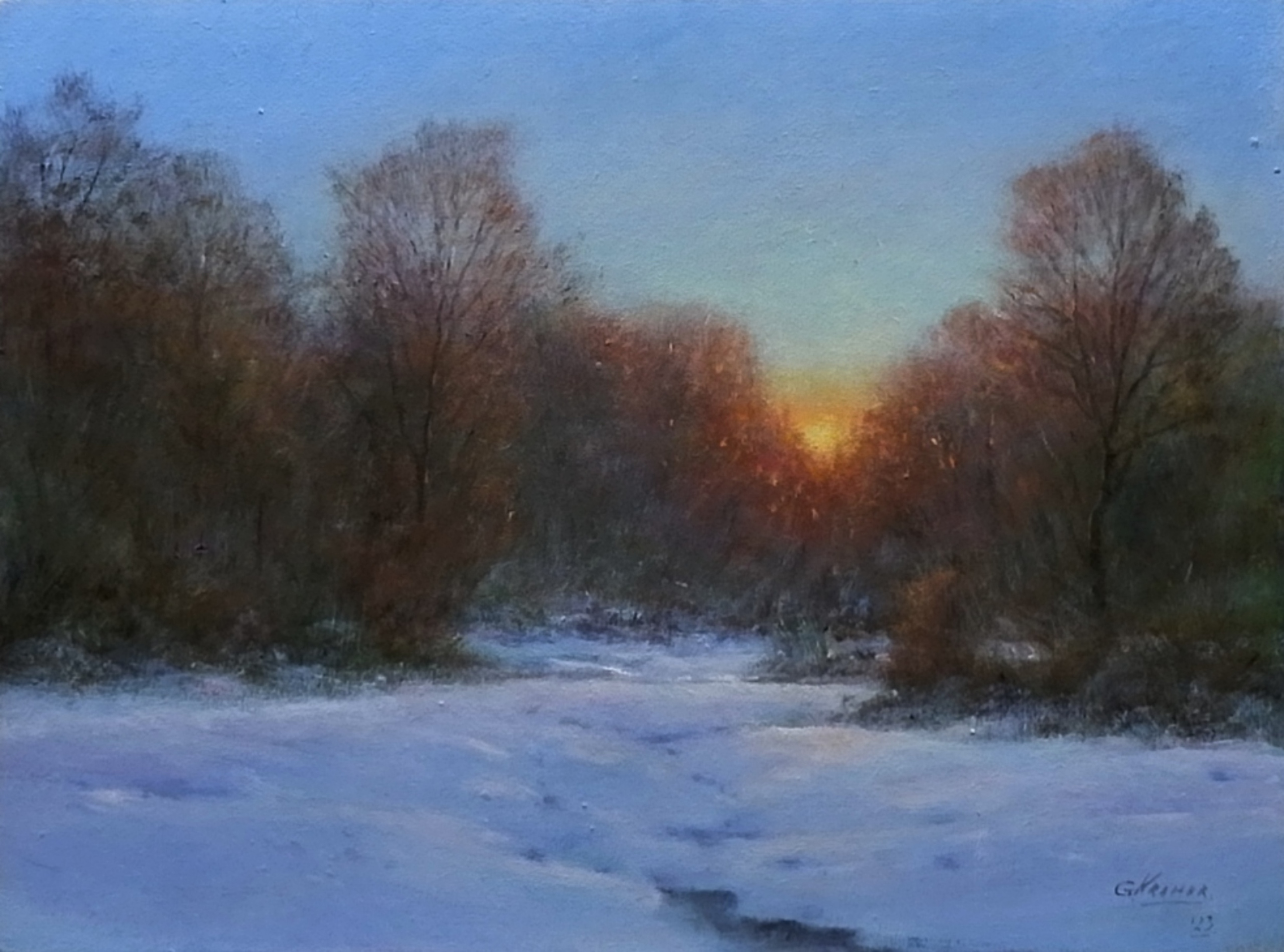 Landschap Zonsondergang Natuur Sneeuw Painting Acrylic Winter Bos Avond Avondlicht Gerard Kramer