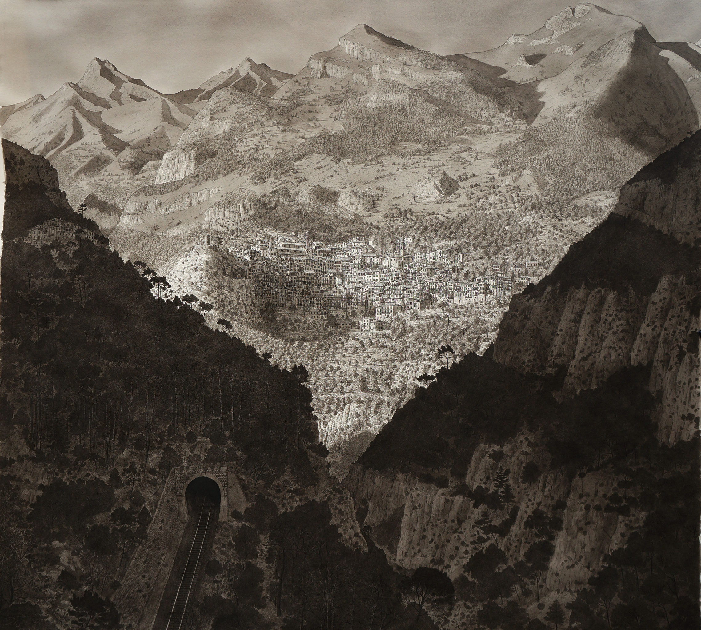 Deze enorme tekening is gemaakt over een periode van precies twee maanden en het is me gelukt om heel dicht bij het oorspronkelijke idee te blijven. Afgelopen oktober, toen ik in de trein van Tende naar Nice zat, zag ik, terugkijkend, dit adembenemende panorama van de 'Village Perché' Saorge hoog boven de Roya-vallei. Deze tekening viert niet alleen de schoonheid van het dorp en deze vallei, maar ook de moed en vastberadenheid van vorige generaties die van deze ruige, afgelegen vallei hun thuis hebben gemaakt en van degenen die de prachtige spoorlijn van Ventimiglia naar Cuneo hebben aangelegd.