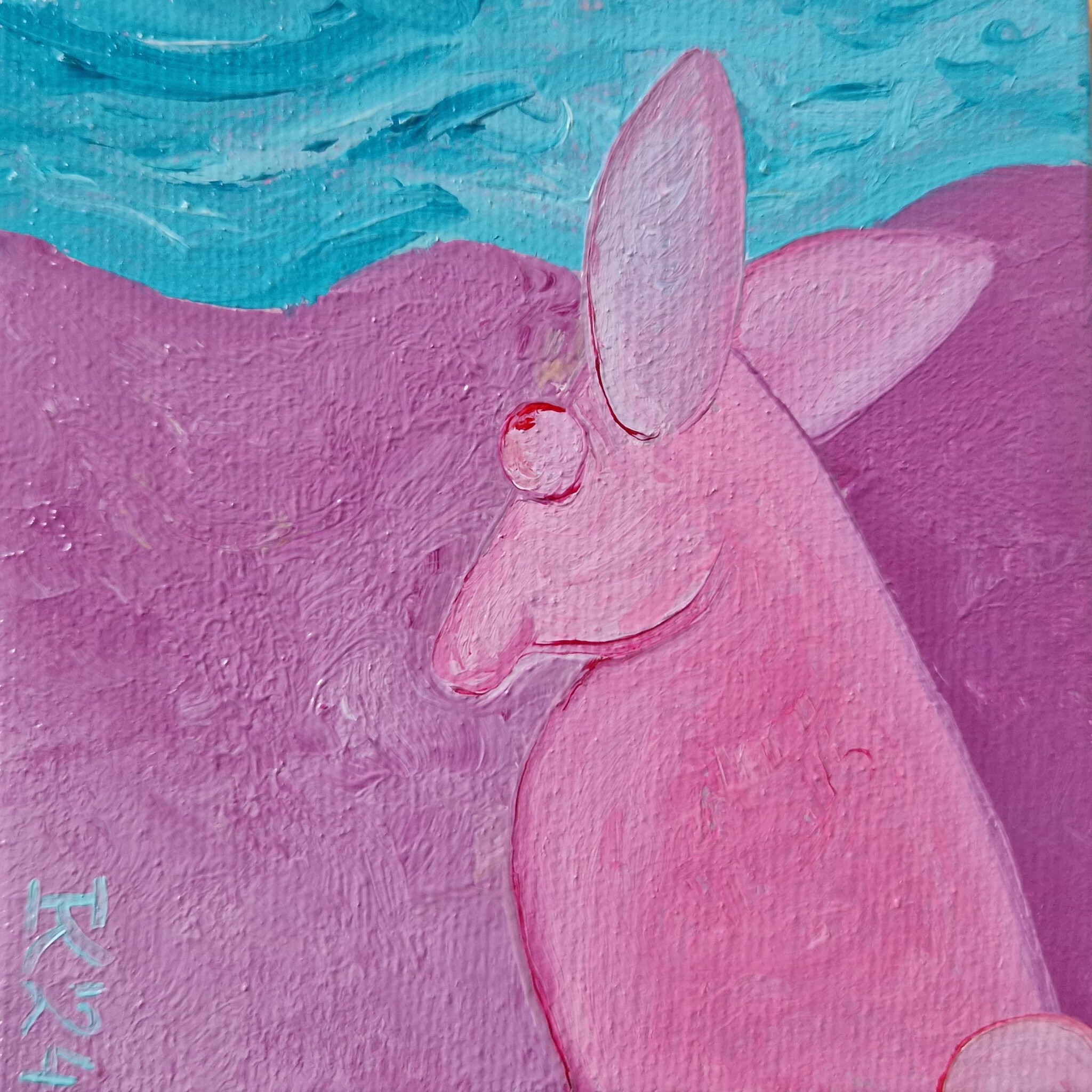 Olieverf op katoen, 10 bij 10 cm, Pictoright. het schilderijtje kan opgehangen worden. In de groep 'Vrolijk' kun je ook Hazelientjes vinden. Als je je aanmeldt voor mijn nieuwsbrief, zie linksonder bij 'contact', krijg je 10% korting bij aanschaf van dit werk. De prijs is zonder verzendkosten.