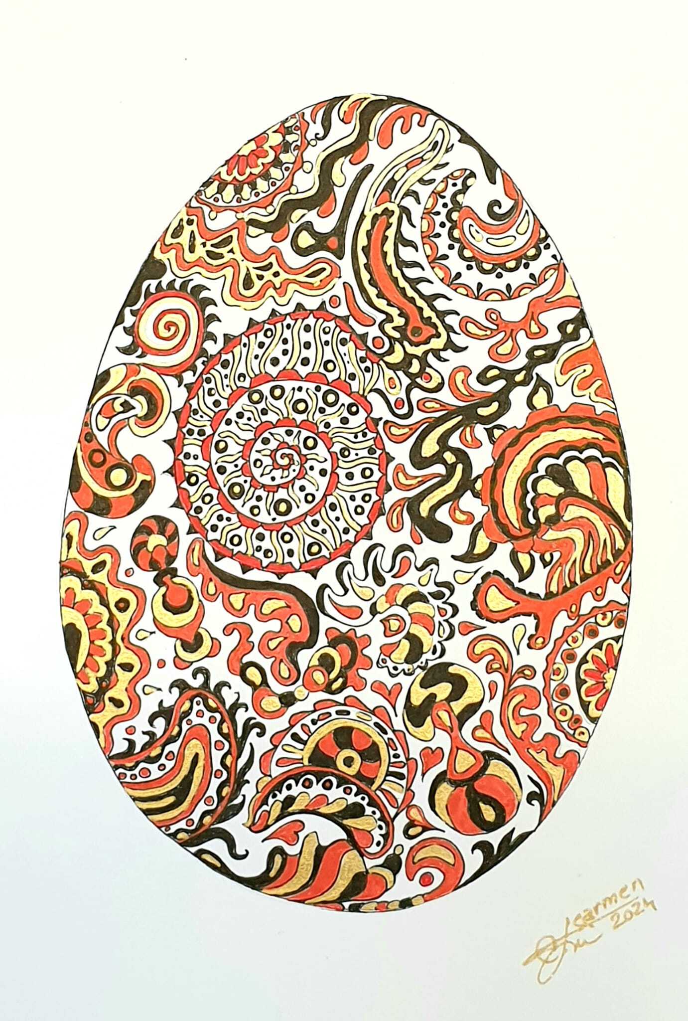 Door mijn roots, in Roemenië, ben ik geinspireerd om deze pentekening te maken. Met Pasen versieren de vrouwen eieren met diverse traditionele motieven en felle kleuren, door deze inspiratie ben geïnspireerd om dit abstracte Paasei te tekenen. De motieven die ik op dit ei had getekend komen niet overeen met onze traditionele symbolen. Het is puur fantasie en misschien zien jullie ook patterns van zentangle in mijn werk.
