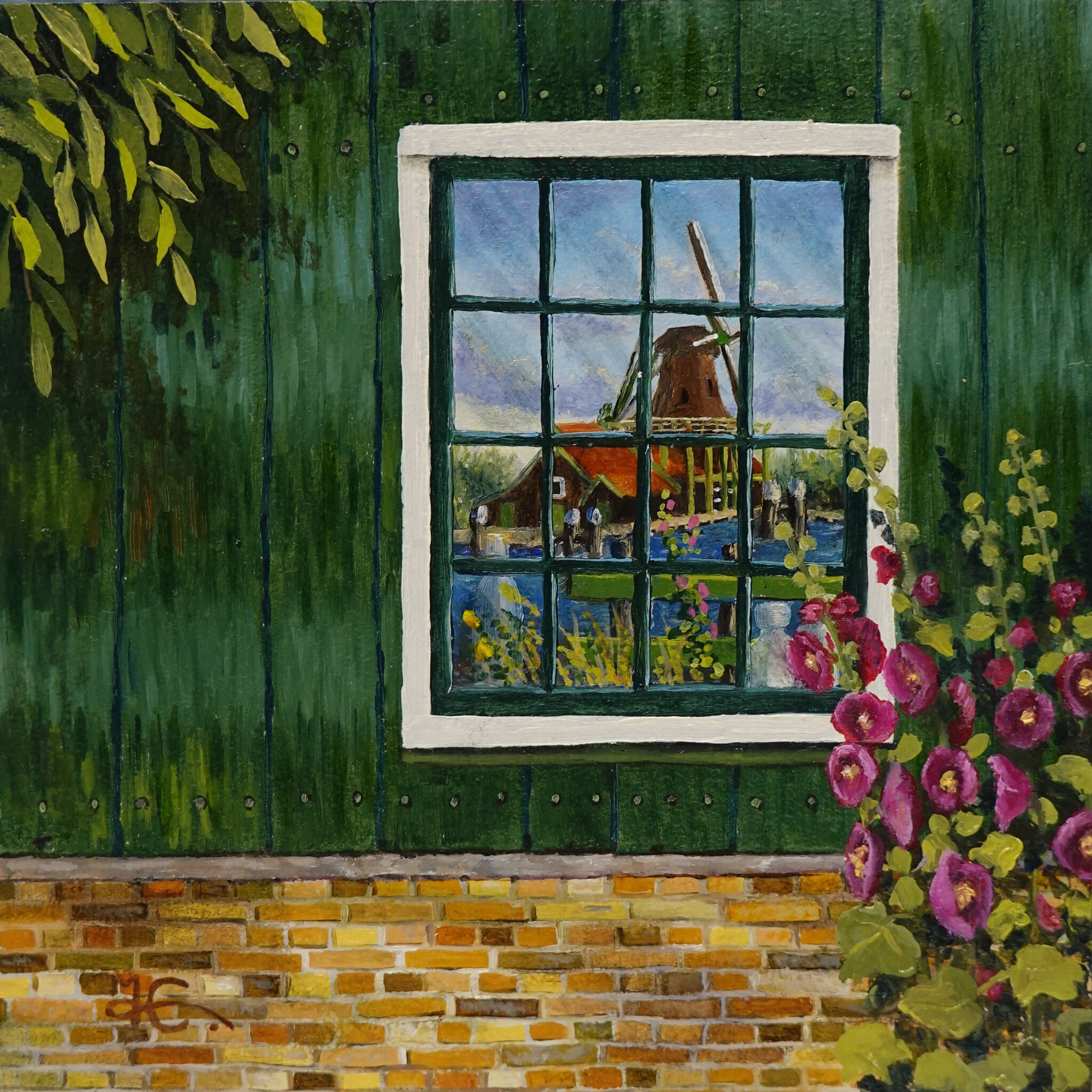 In het glas zie je een spiegeling van verfmolen De Kat aan de Zaanse Schans. Hier worden de fijnste pigmenten gemaakt voor kunstenaarsverven.
