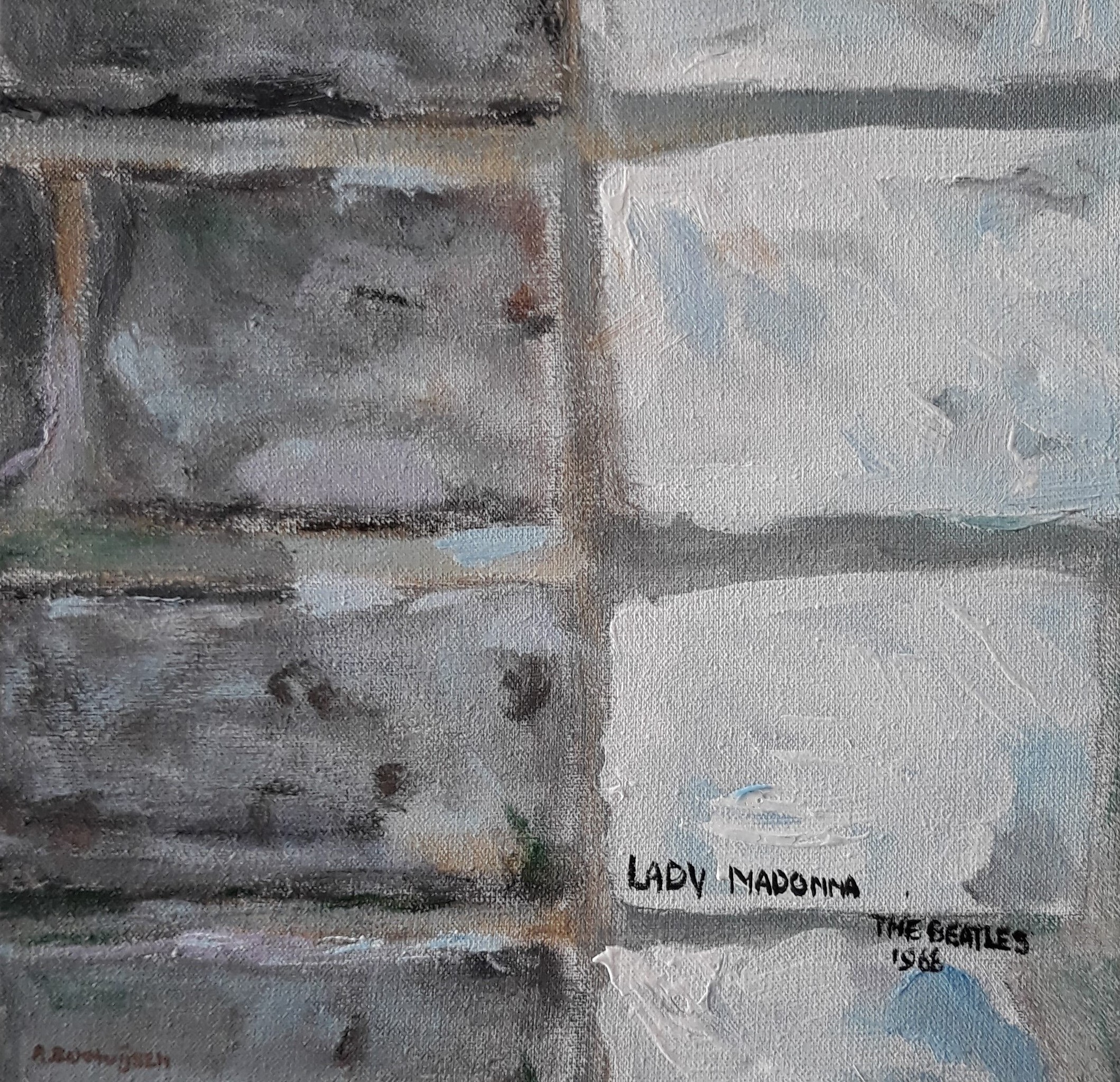 The Beatles steentje "Lady Madonna"1968, afmeting 20 x 20 x 3 cm, acrylverf op doek..