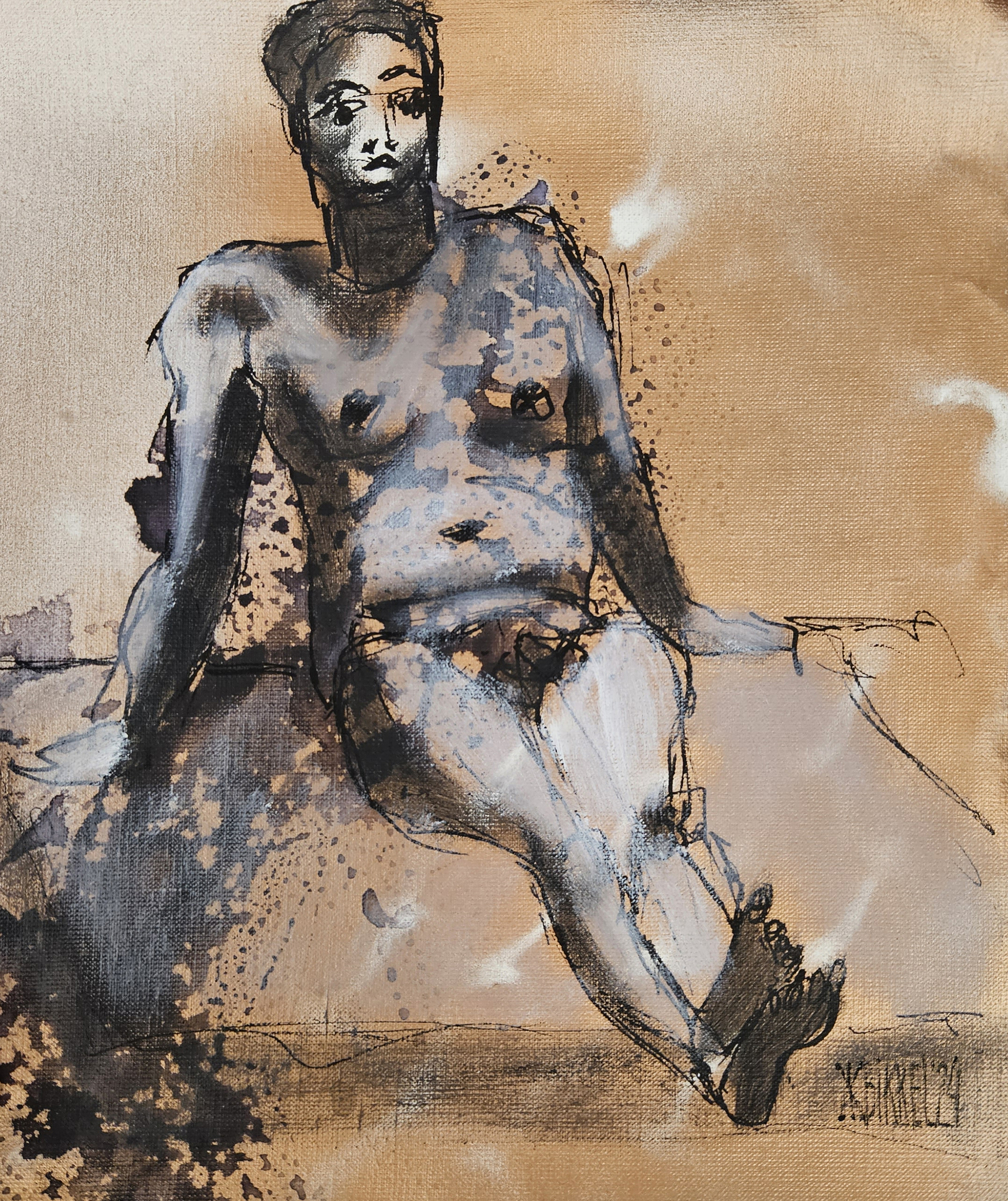 Bikkel - male model drawing 2 - mixed media on linen - 35x30cm - 2024