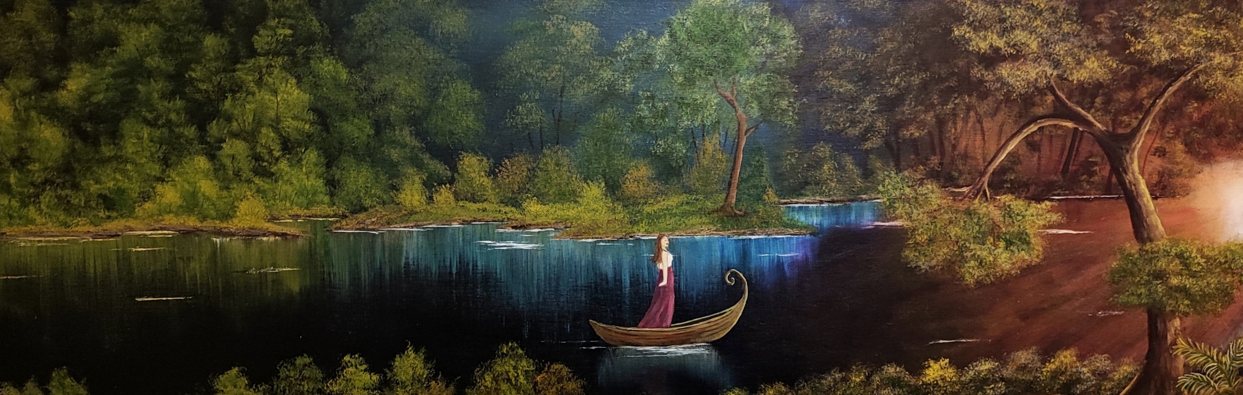 Ga mee met de stroom van het leven, want alles wat je nodig hebt is daar! Vaak roeit men tegen de stroom in wat enorm uitputtend is en ook niet leidt naar waar je zou moeten en willen gaan. Dit komt meestal uit angst voor het onbekende, maar juist daar wacht het mooie nieuwe op je. Dus stop met roeien, net zoals de vrouw in de boot. Zij staat om duidelijk te laten zien dat ze vol vertrouwen meegaat met de stroom. Ze heeft ook geen roeispanen en haar 'schat', alles wat ze zich maar kan wensen, is al bijna voelbaar, bijna binnen handbereik. Een echte eye-catcher aan de muur! Bijzonder door de breedte van het werk, maar uiteraard vooral door wat weergegeven wordt. Het kleurenspel naar het eind van de rivier toe is heel mooi! Daar gaat het blauw, groen, gele palet over naar paars, warm oranje en geel. Als dit doek op een lichte plek hangt, of (late middag) zon vangt, springen die kleuren er fantastisch uit! Een spotje heeft wellicht hetzelfde effect. Vanwege de afmeting is verzending van dit doek duurder. Het kan opgehaald worden.