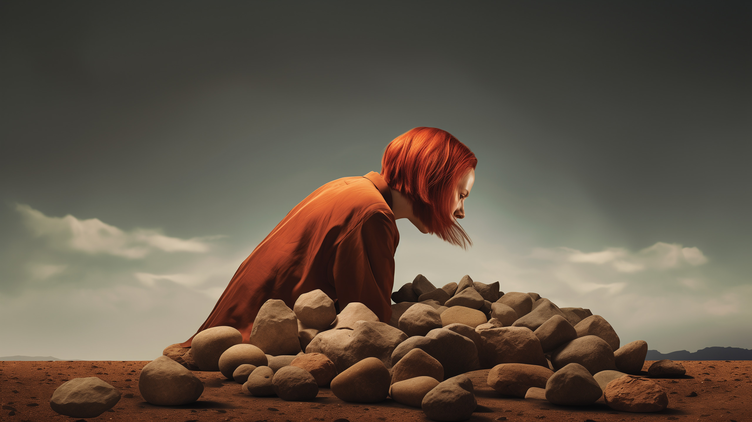 On the edge of oblivion, she kneels, a solitary figure against the vastness of an arid world. Her hair, the color of a dying flame, spills forward, a bright contrast to the dull stones that gather before her. She is the alchemist of the desolate, seeking to transmute the barren into the bountiful. Around her, the stones are not mere fragments of the earth, but symbols of the sustenance she yearns for in a land where nothing grows. Each one is a hope, a prayer cast into the hard ground, a wish for life where only emptiness thrives. The sky looms large, indifferent to her struggle, yet she persists. This is a meditation on perseverance, a hymn to the unyielding human spirit that hungers for more than mere survival. Here, in this stark landscape, she is a monument to resilience, a whisper that even in the most inhospitable reaches, we dare to feed our dreams.