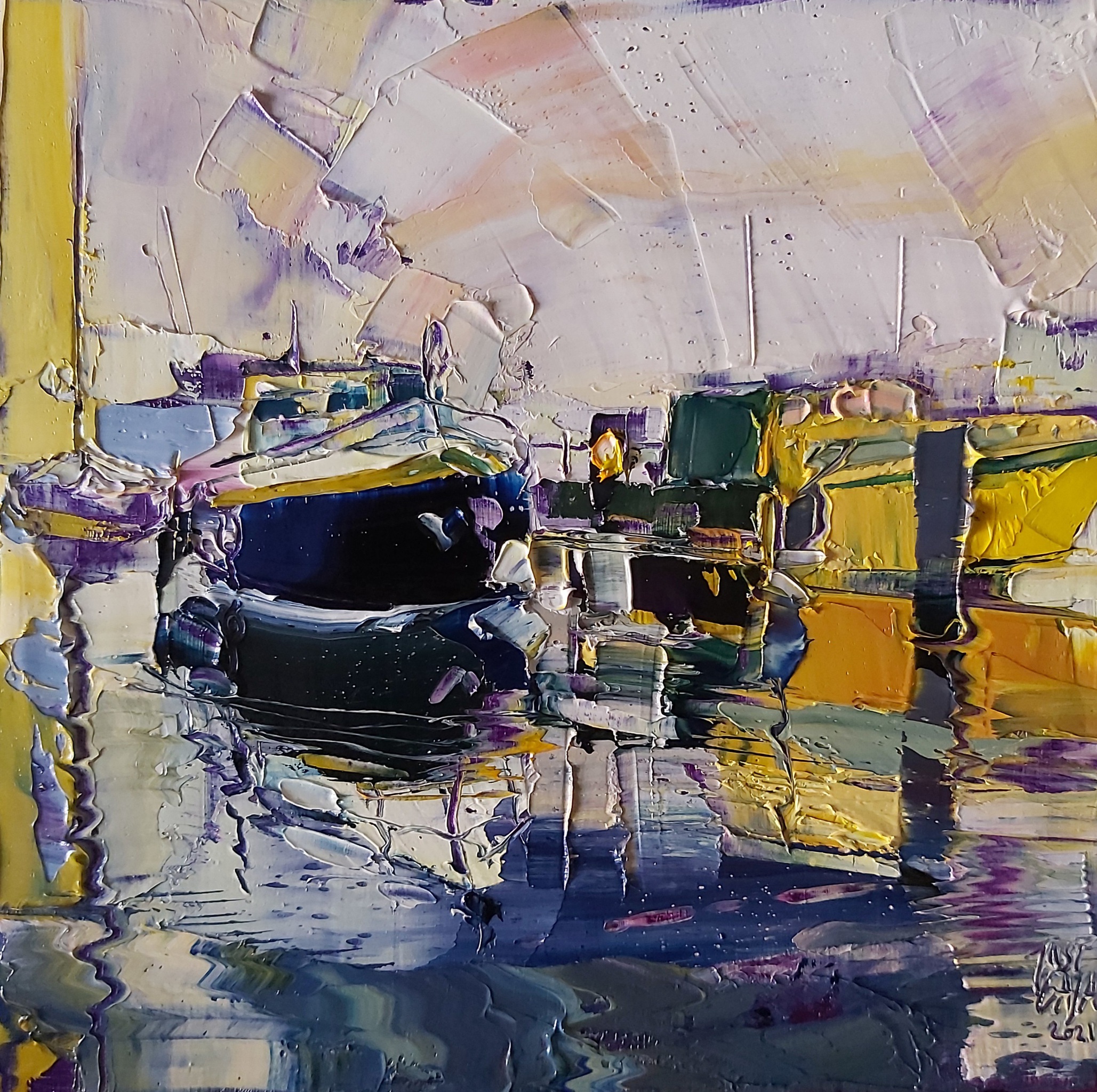 Schilderij Oranje Geel Yellow Paars Blue Water Oil Canvas Painting Harbour Violet Haven Mist Boot Jacht Boat Boats Happy Indigo Fog Yacht Colourfull Impasto Oileverf