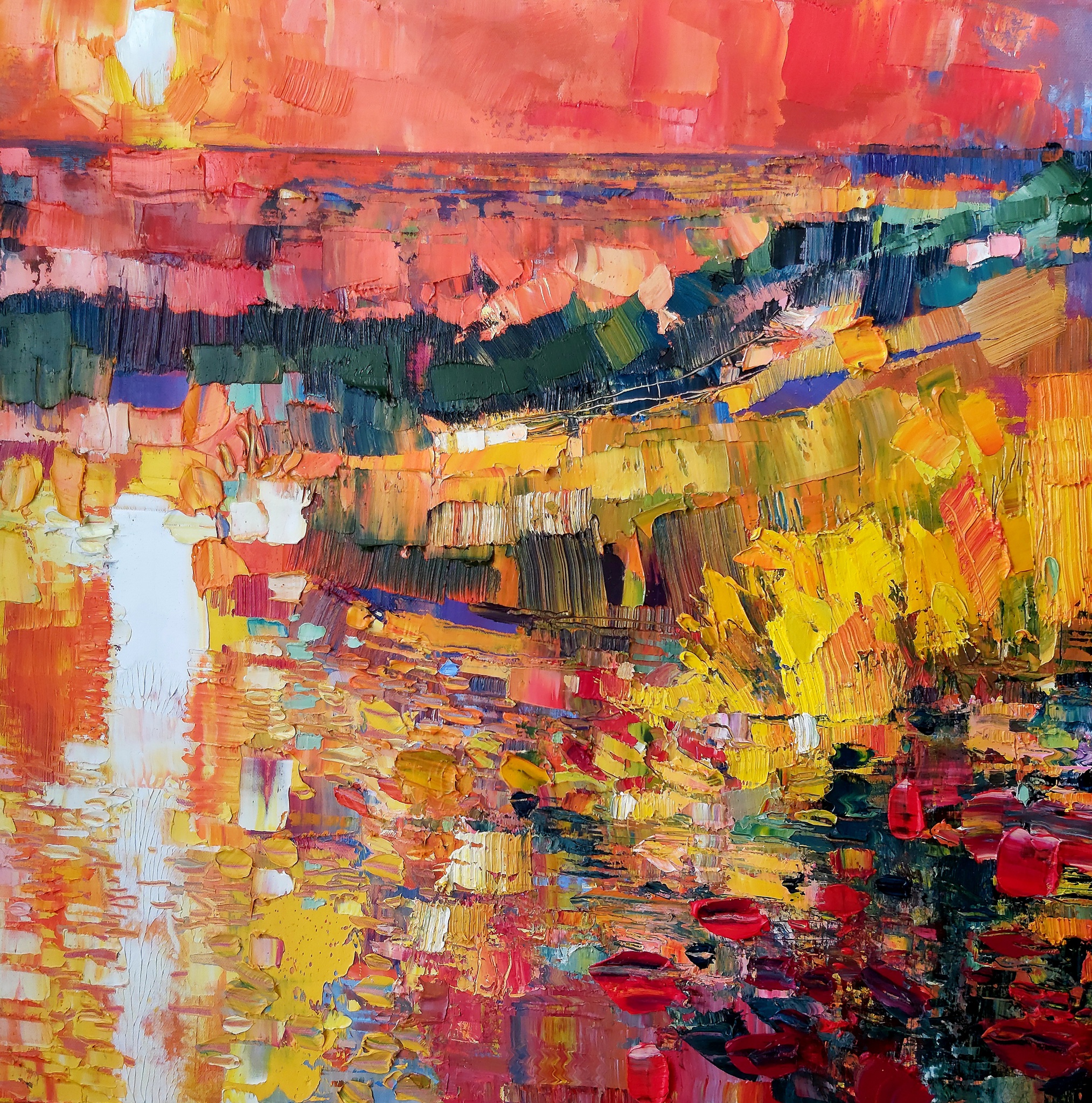 Schilderij Abstract Landschap Art Water Kleuren Kleurrijk Oil Canvas Kunst Dutch Polder Sky Landscape Figurative Vijver Pink Artist Lotus Impression Meer Waterlelies Pond Small Semi