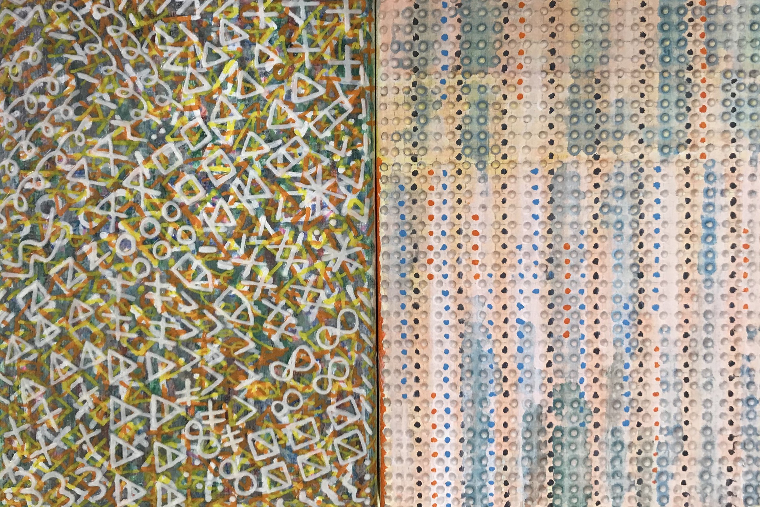 Als experiment hebben Josée Wuyts en Frans de Groot 2 structuurschilderijen samengebracht tot 1 geheel. Links is van Josée en rechts van Frans.