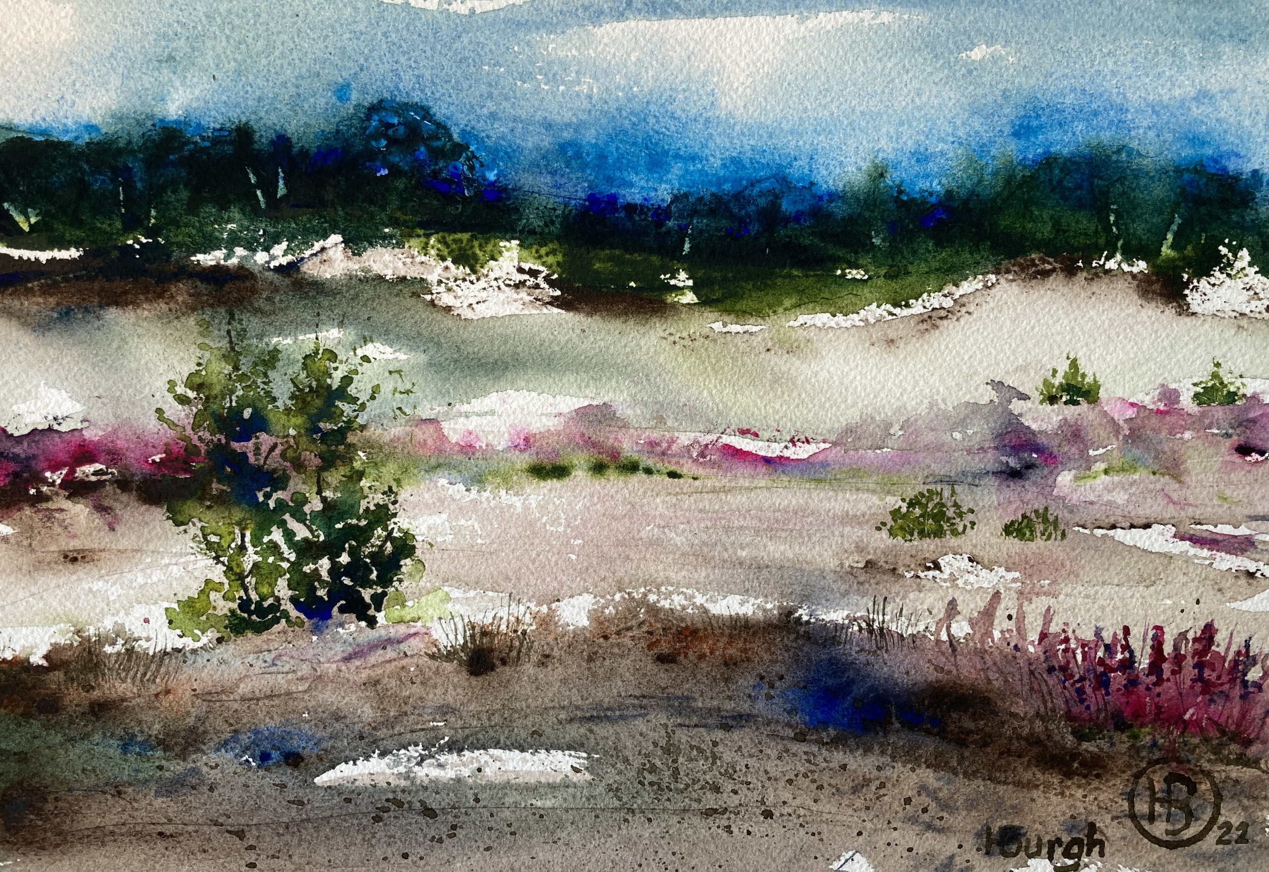 Gemaakt met de creditcard techniek. Maar eerst live op locatie geschilderd. De sfeer in een aquarel kan je het beste vangen als je zelf op de locatie geweest bent en je hebt laten betoveren door het landschap