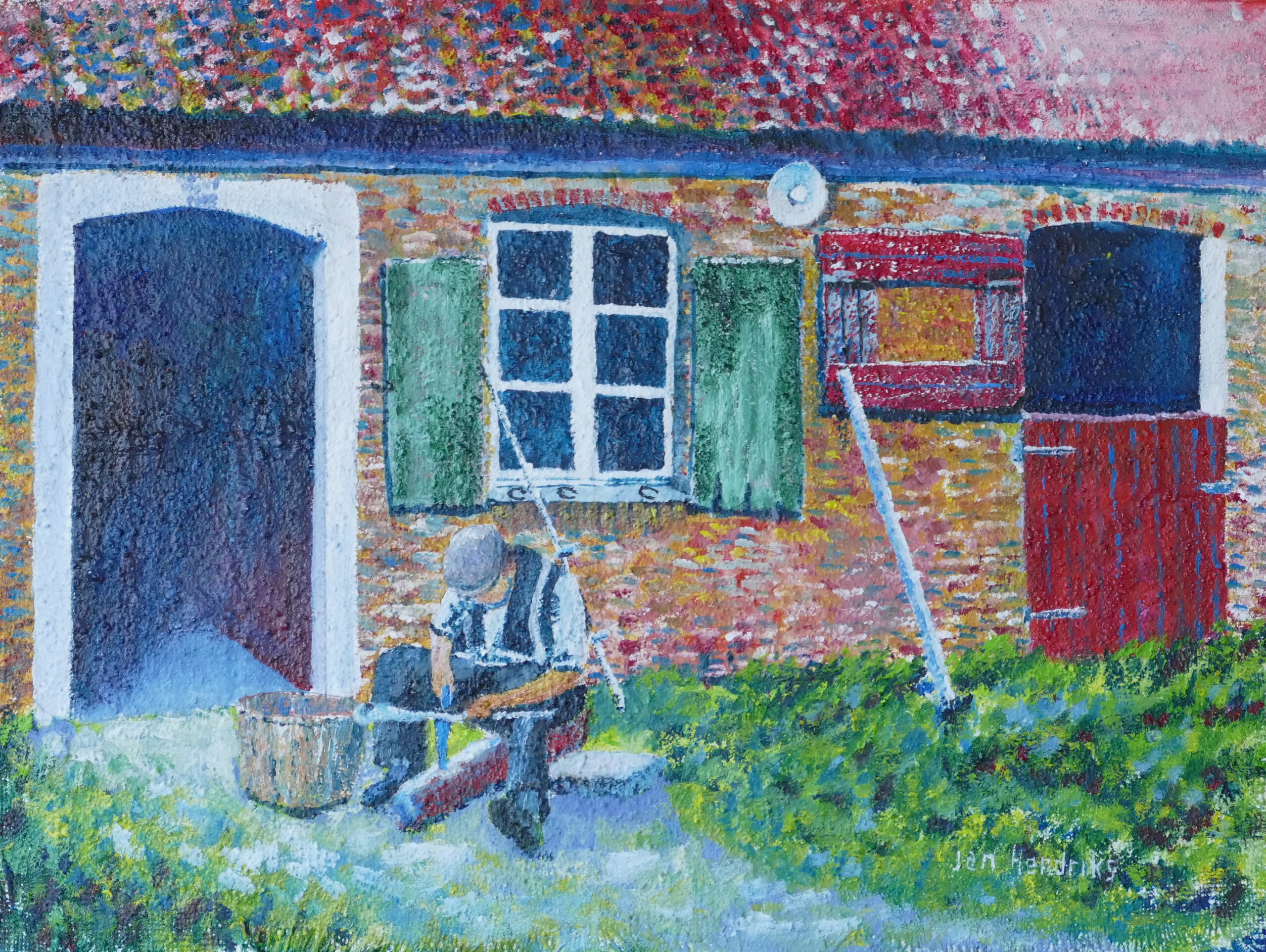Werk gemaakt op basis van een oude zwart wit foto uit 1960. Willem van Rijt bij het haren van de zeis.
