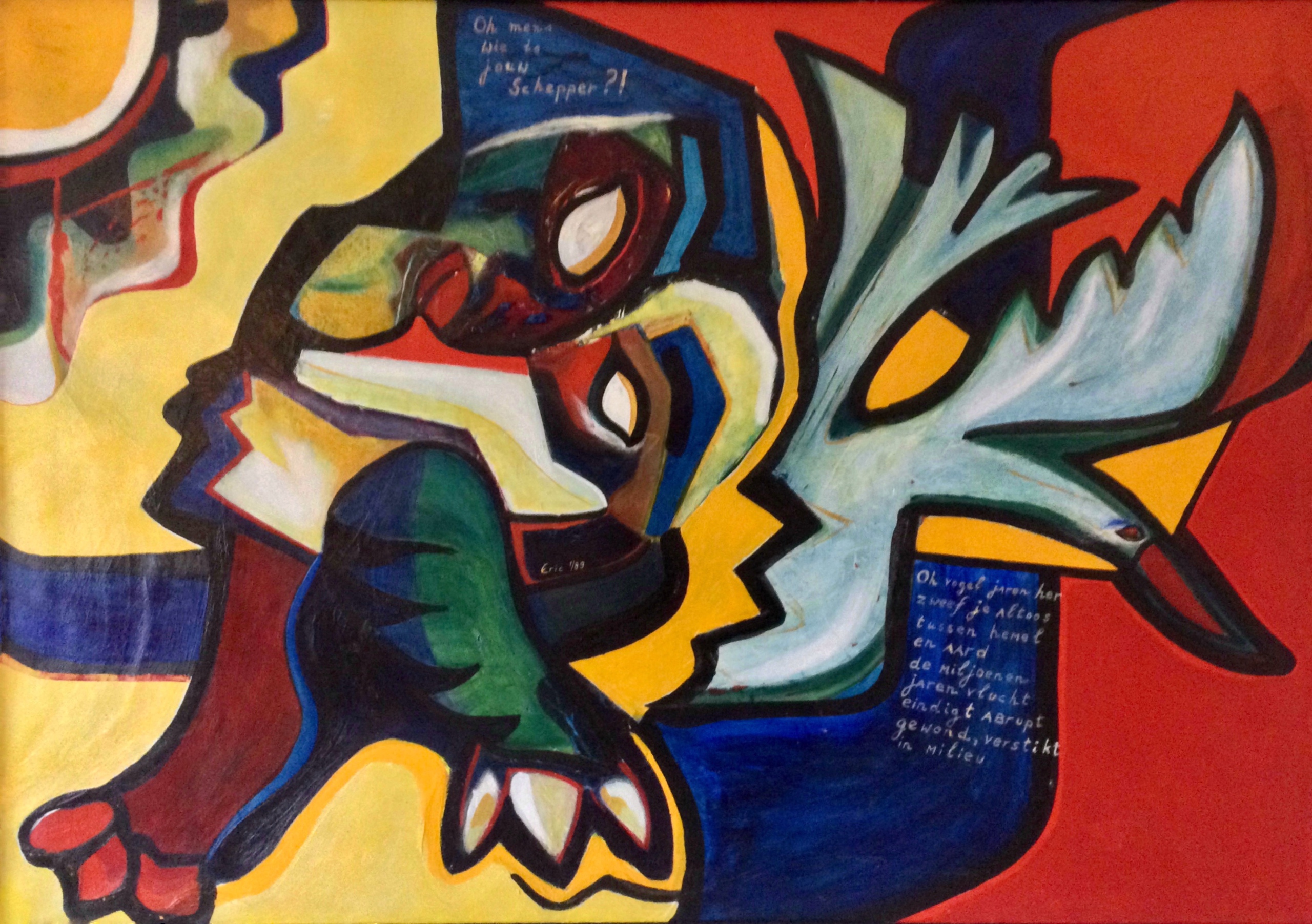 Oh vogel jaren her zweef je altoos tussen hemel en aard de miljoenen jarenvlucht eindigt abrupt verstomd, verstikt In milieu. oh mens wie is jouw Schepper?!