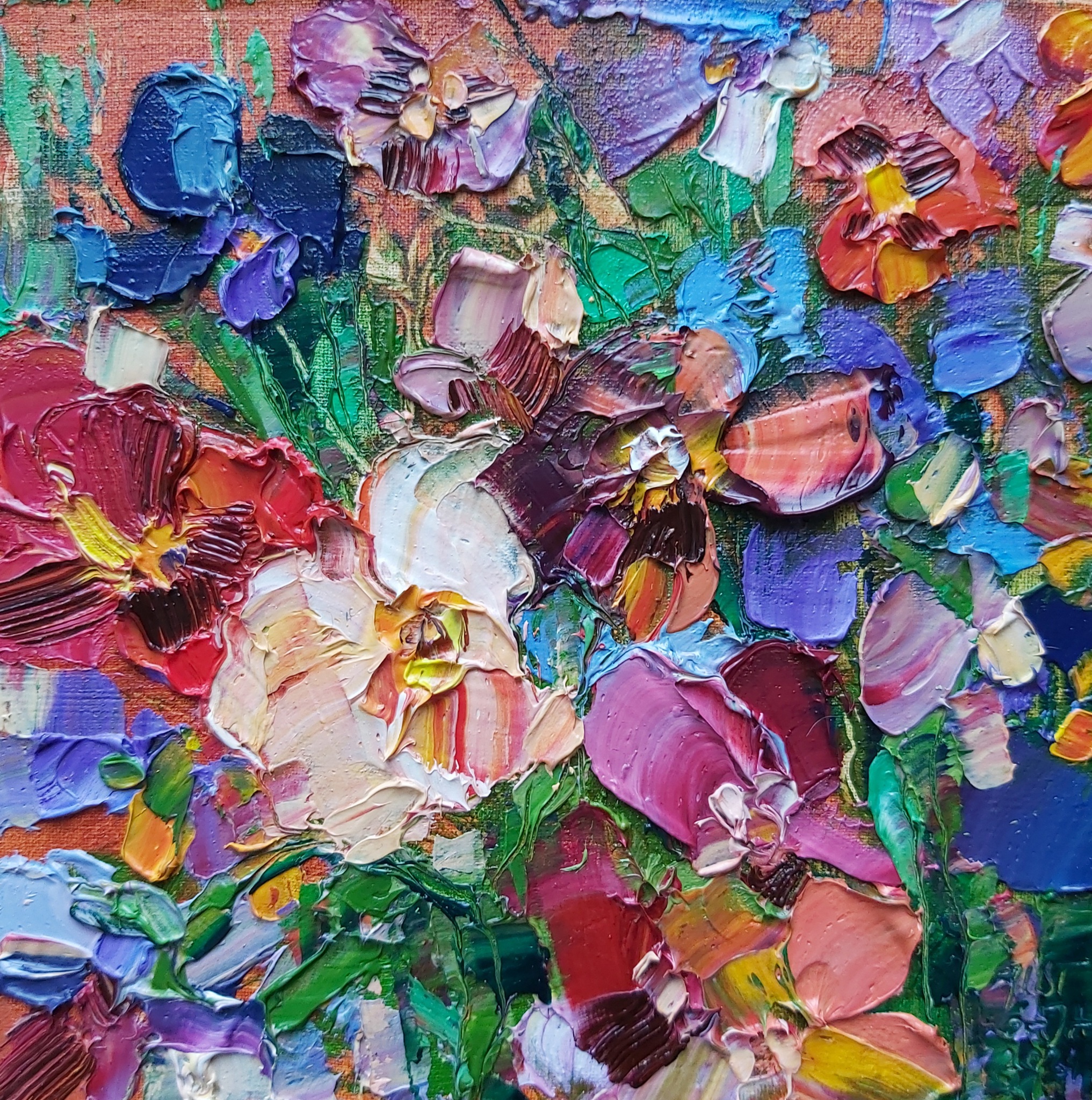 Schilderij Abstract Rood Paars Bloemen Art Kleurrijk Oil Canvas Kunst Bloem Violet Still Life Flowers Figurative Stillevens Artist Impression Kleine Miniatuur Happy Woonkamer Levendig Viooltjes