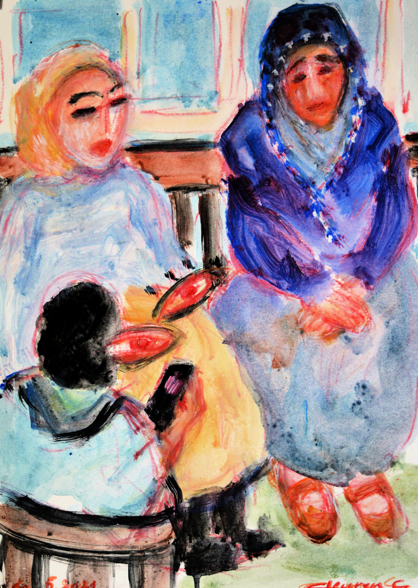 Bij een afspraak in het ziekenhuis met de vrouwelijke oorarts moest ik eerst de tijd doorbrengen in de wachtkamer. Het was moeilijk om de juiste afdeling te vinden, want zowel de informatie als de lift gaven een verkeerd nummer aan. 252 bleek 253 te zijn aan het einde van een gang naar links. Mijn registratiestickers lagen op de infobalie. Ik wachtte in een open ruimte bezet door twee vreemden, waaronder een lief geklede oude dame, ze zag er prachtig uit met een sjaal in donkerblauw, afgezet met een sierlint zoals je alleen bij moslims aantreft. Haar prachtig geknoopte hoofddoek viel in een punt op haar borst en fonkelde met auberginekleurige rozen. Haar hele outfit was veranderd van paarsblauw naar donkerblauw, waaronder glanzende okerkleurige kinderschoentjes puilden. Ze zag er prachtig uit, die oude dame, die ik begroette met mijn ogen en waarop ze reageerde met een stil knikje.