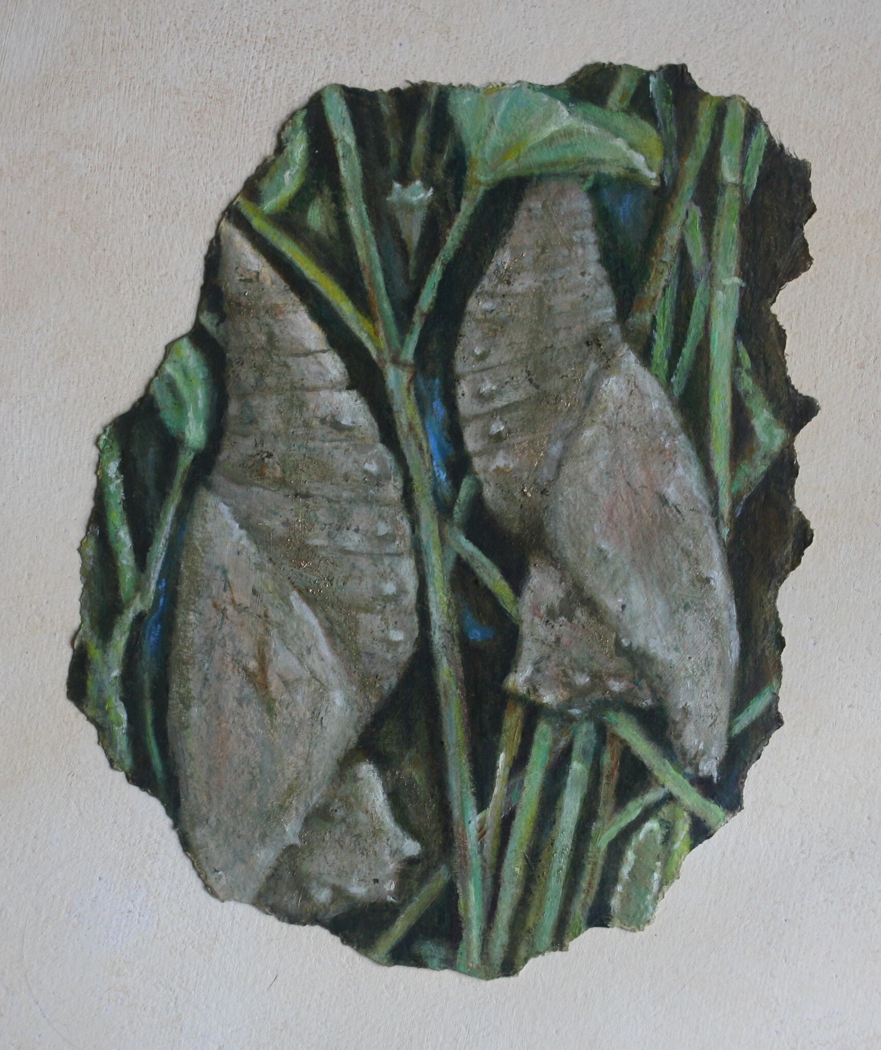 Rupsen van de atalanta hebben zich verpopt in de tuin. Olieverf en goudverf op bamboepapier