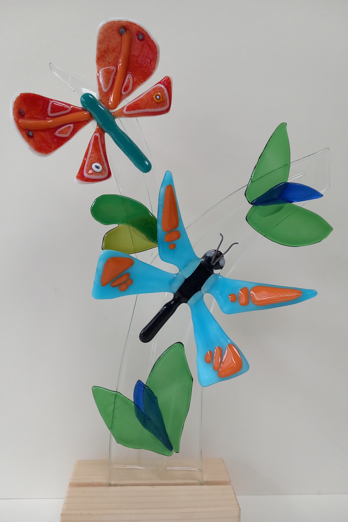 Dit vrolijke werkje is deels gemaakt van 96 glas en deels van gerecycled glas. De vlinders zijn 3D door het slumpen van de vleugels. Leuk voor het raam, op de vensterbank, tussen de planten. Het geheel is gemonteerd op een blokje van 4 cm hoog.