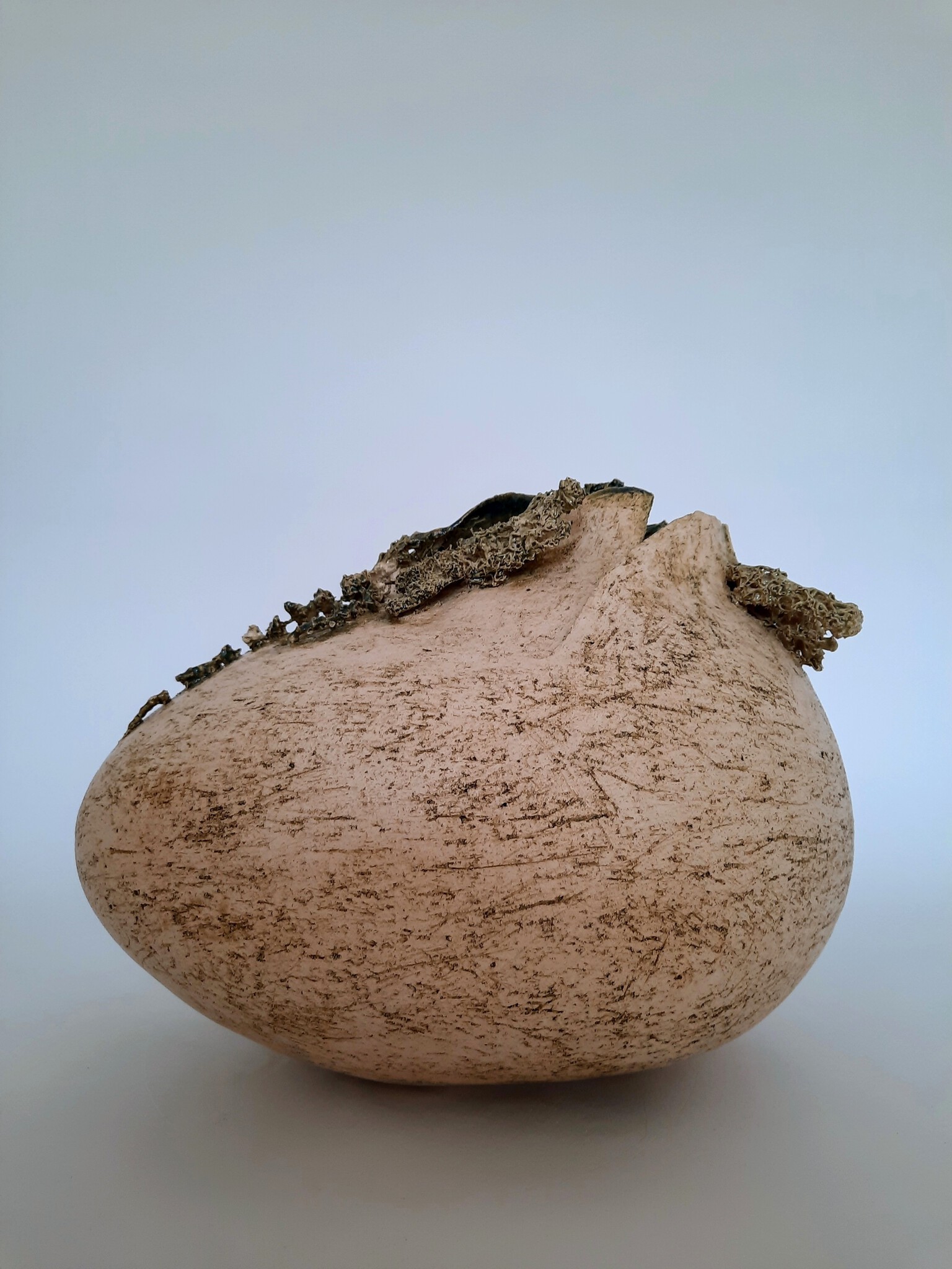 Ei met bloeiende binnenkant, aardewerk, grove chamotteklei en gietklei. Geglazuurd.