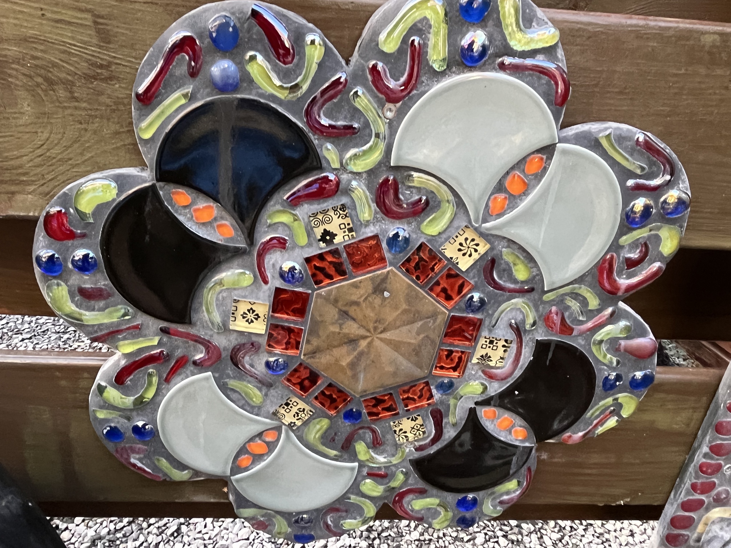 Kleurrijke en warme mozaïek gemaakt met liefde. Wij maken samen grote projecten en óók onze eigen stukken. Het verwerken van verschillende materialen is een belangrijke kenmerk van ons werk.