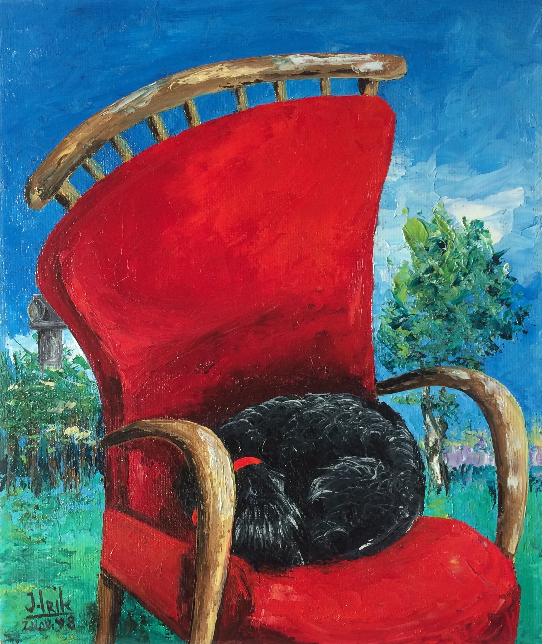 Onze hond Daan in rode rieten stoel, toen hij bij me lag tijdens het schilderen.