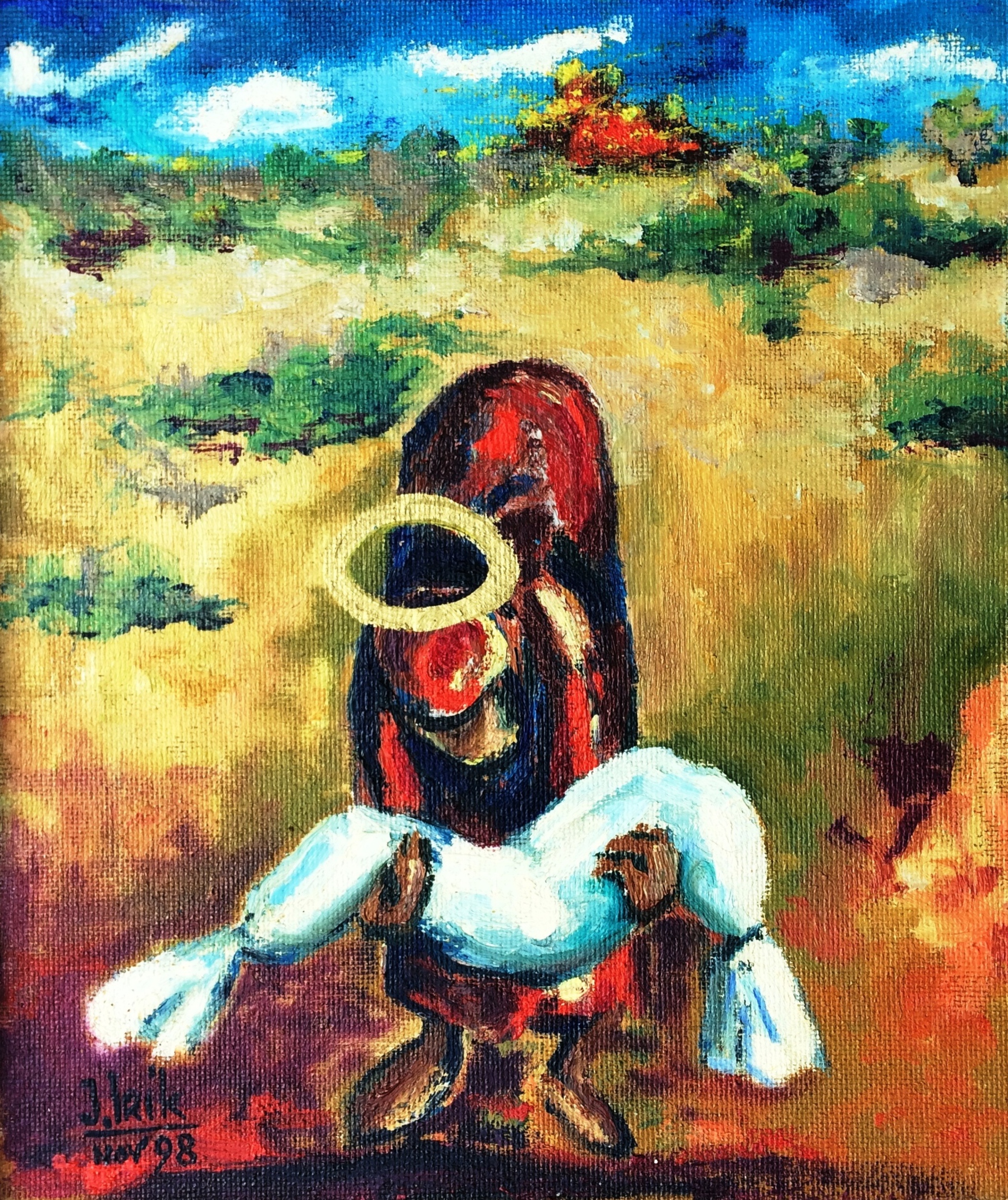 Een vrouwfiguur die een in doek gewikkeld kind draagt dat in in de aarde wordt gelegd.
