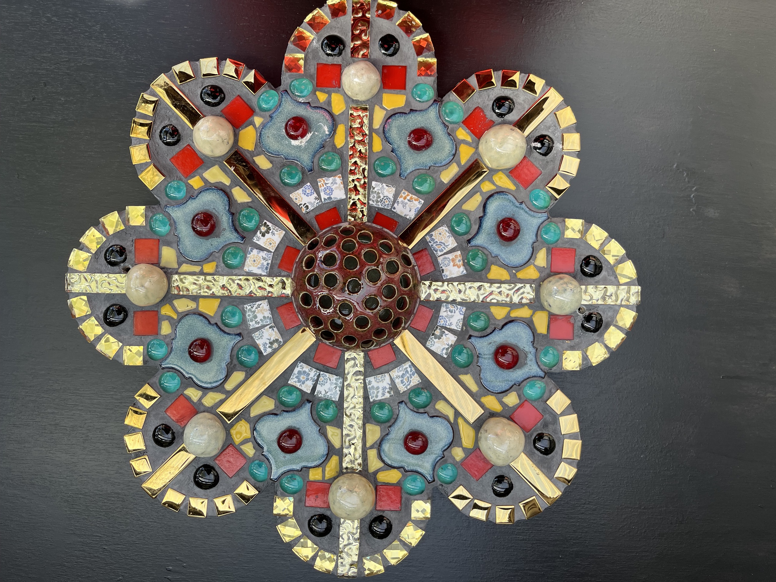 Kleurrijke en warme mozaïek gemaakt met liefde. Wij maken samen grote projecten en óók onze eigen stukken. Het verwerken van verschillende materialen is een belangrijke kenmerk van ons werk.