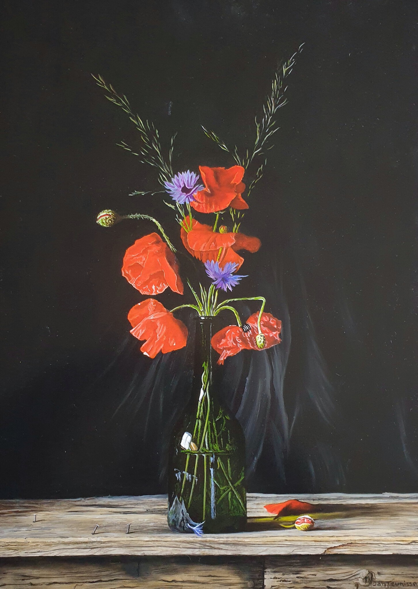 Klaprozen en korenbloemen in groene fles
