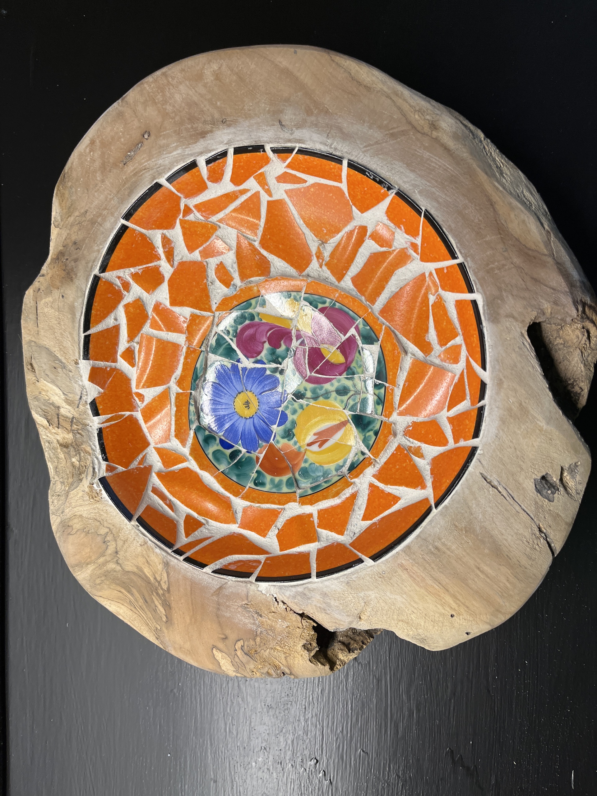 Teakhouten schaal gevuld met oranje mozaïek. Oud bord , wit gevoegd.