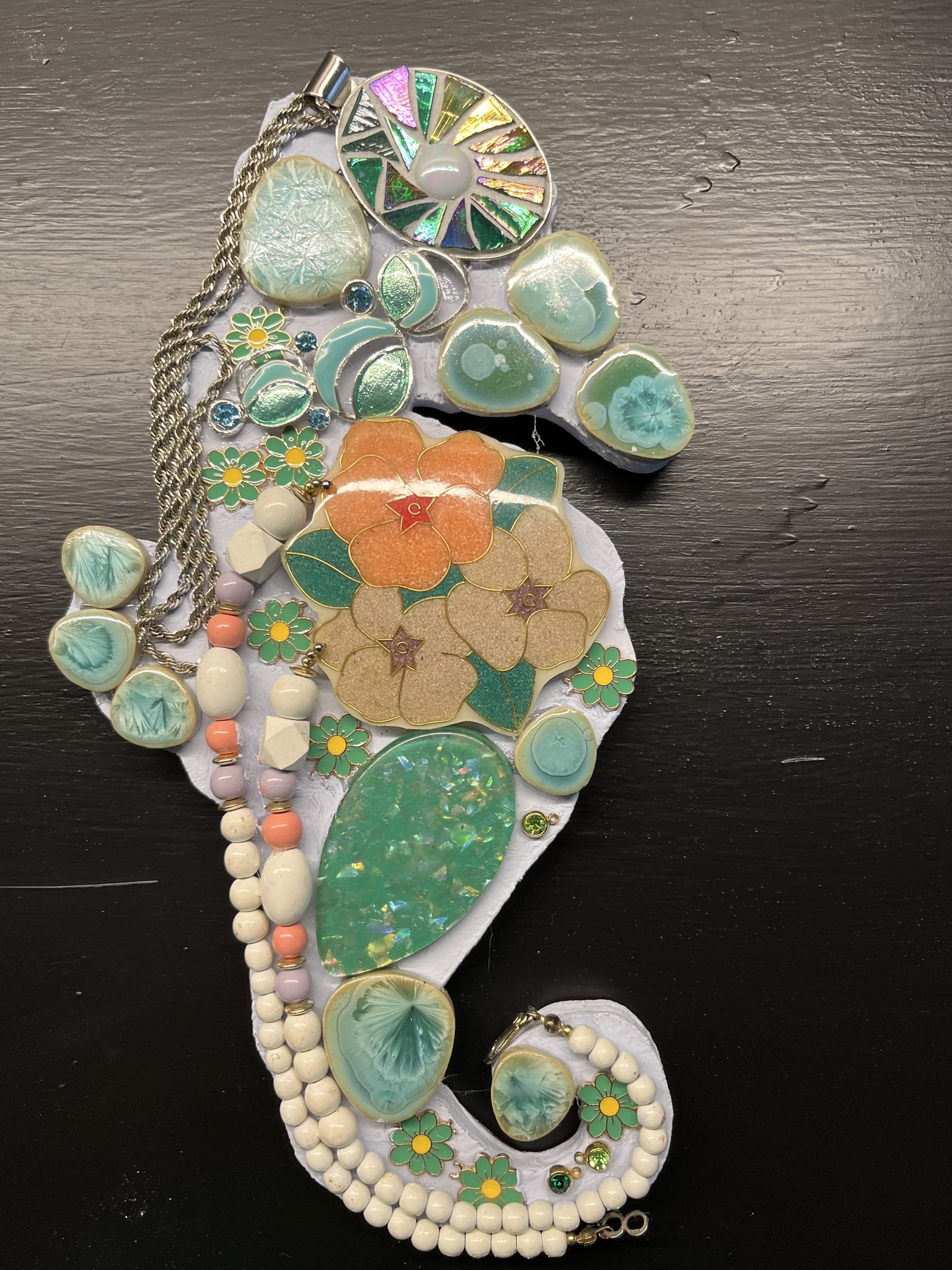 Zeepaard, ondergrond hout bewerkt met sieraden en keramiek.