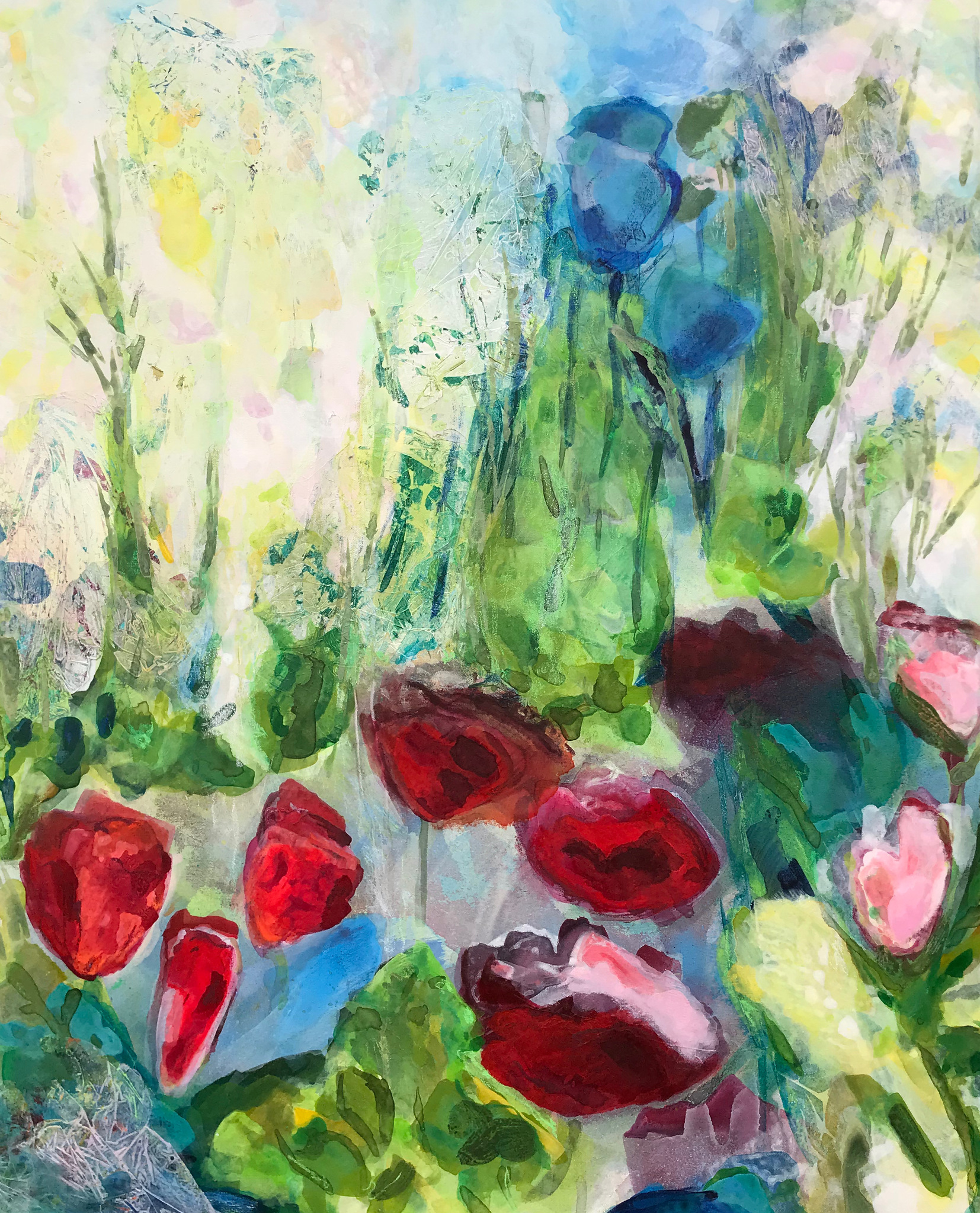 In het atelier ga ik het opbouwen van kleurlagen verbinden met de voorstelling van bloem en bladvorm. In de vorm toont zich de karakteristieke bloem. Een 'proces van groeien' vanuit de verf.