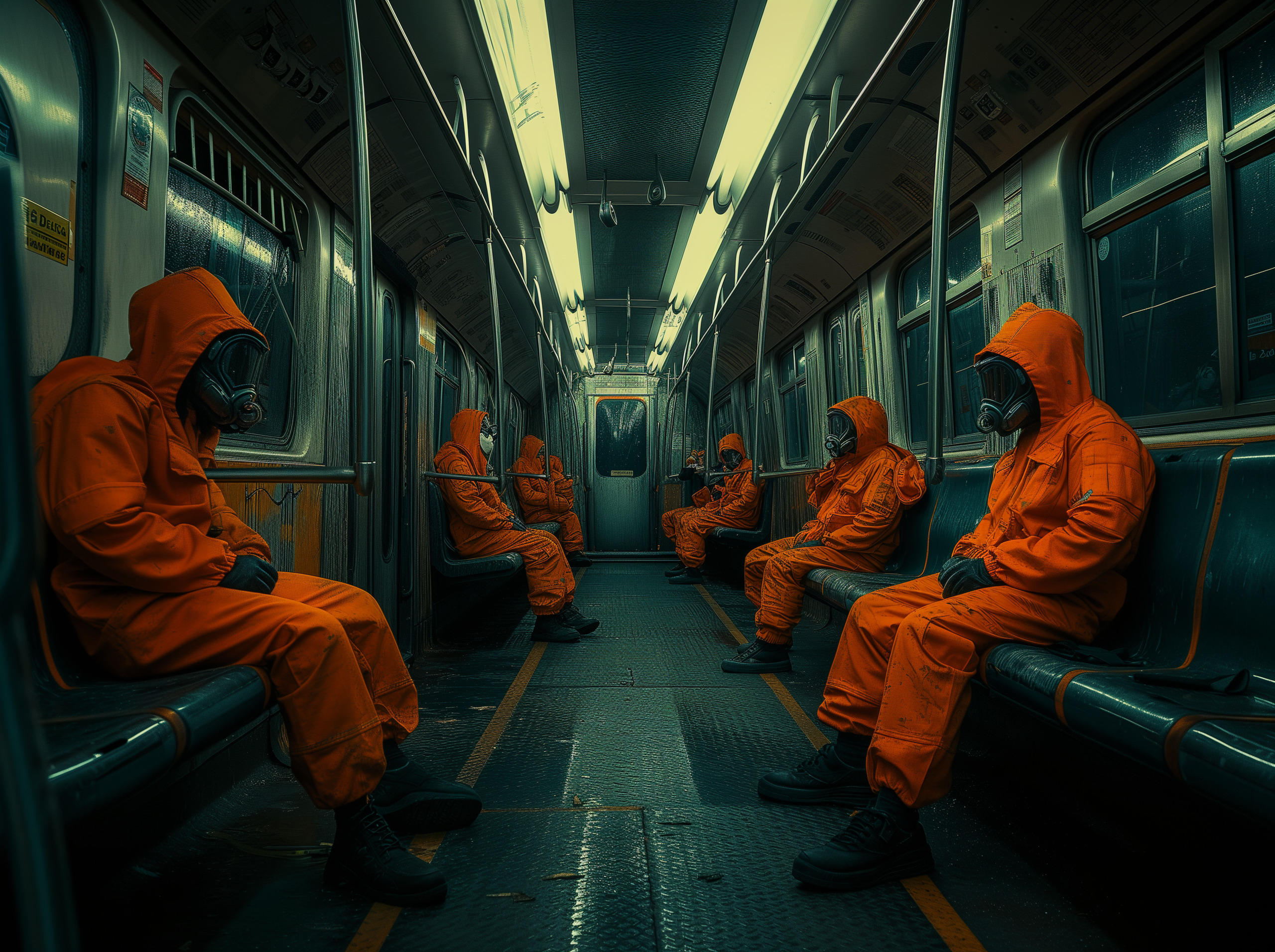 A silent journey unfolds beneath a city that no longer sees the sun. The passengers, shrouded in garments that speak of a world upended, are the remnants of a society that danced too close to the precipice of its own making. There's a rhythm to their travel, a cadence that echoes the heartbeat of a world now out of time. The train, once a vessel of bustling life and noise, glides through the darkness, a serpent in the bowels of a dying earth. Its occupants are the keepers of stories untold, each a guardian of the last vestiges of hope in a realm where hope has become a currency as rare as the light they yearn for. They do not speak, for their mission is one of quiet resistance, a defiance against the end of days. The journey is long, and the destination uncertain, but they ride, each with their own vigil, a silent oath to preserve the flickering flame of humanity's legacy.