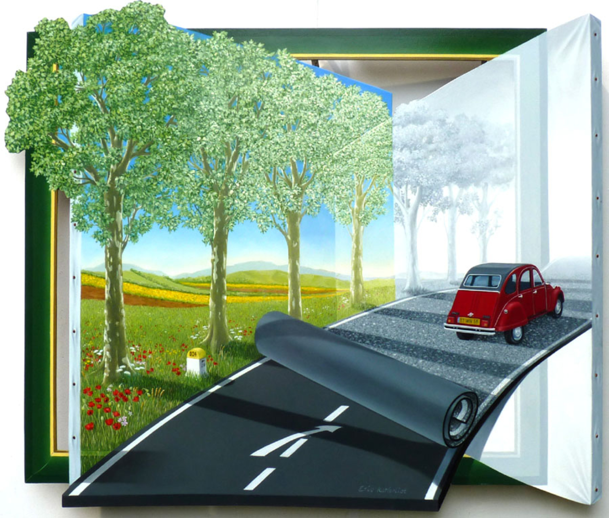 Eric Kerkvliet schildert met olieverf uiterst gedetailleerd voorstellingen op iets verhoogd paneel waardoor bij juiste belichting een Trompe-l’oeil-achtig effect ontstaat.