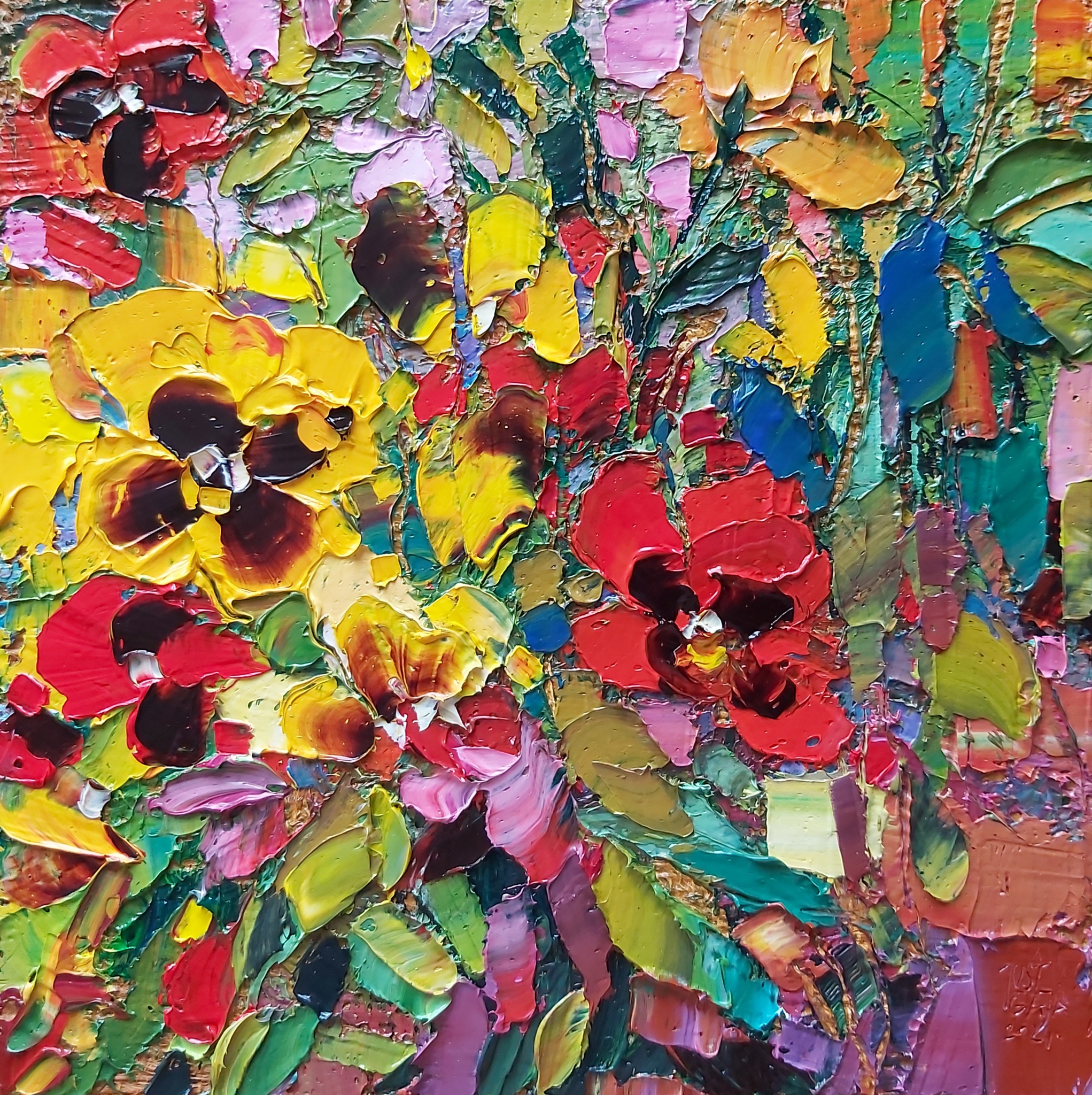 Schilderij Abstract Rood Oranje Geel Paars Groen Bloemen Klein Art Kleurrijk Oil Canvas Kunst Painting Flowers Figurative Paletmes Artist Impression Small Happy Woonkamer Levendig Viooltjes